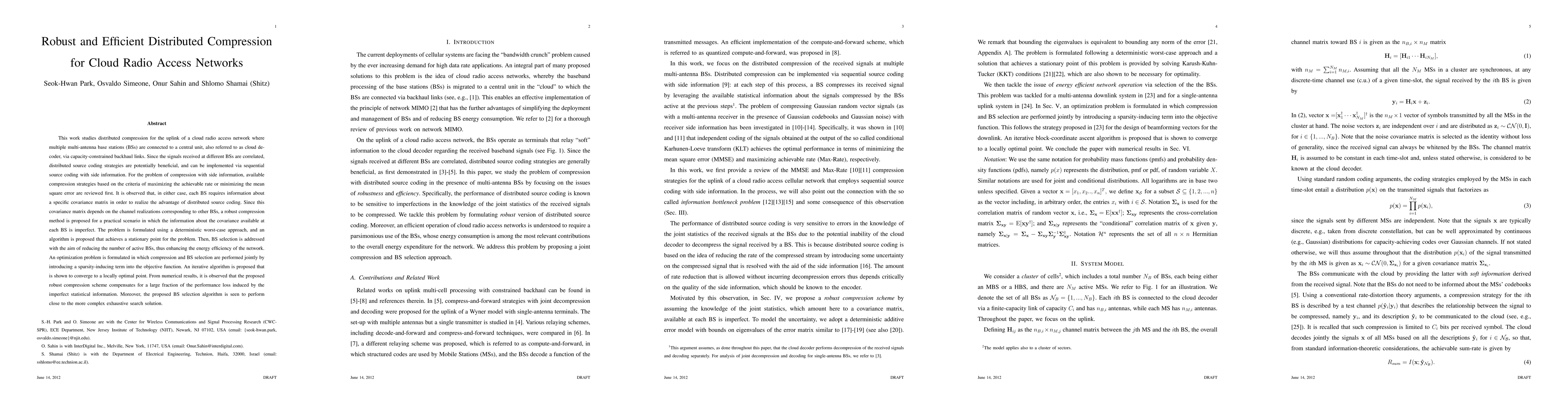 This work studies distributed compression for the uplink of a cloud radio access network where multiple multi-antenna base stations (BSs) are connected to a central unit, also referred to as cloud decoder, via capacity-constrained backhaul links. Since the signals received at different BSs are correlated, distributed source coding strategies are potentially beneficial, and can be implemented via sequential source coding with side information. For the problem of compression with side information, available compression strategies based on the criteria of maximizing the achievable rate or minimizing the mean square error are reviewed first. It is observed that, in either case, each BS requires information about a specific covariance matrix in order to realize the advantage of distributed source coding. Since this covariance matrix depends on the channel realizations corresponding to other BSs, a robust compression method is proposed for a practical scenario in which the information about the covariance available at each BS is imperfect. The problem is formulated using a deterministic worst-case approach, and an algorithm is proposed that achieves a stationary point for the problem. Then, BS selection is addressed with the aim of reducing the number of active BSs, thus enhancing the energy efficiency of the network. An optimization problem is formulated in which compression and BS selection are performed jointly by introducing a sparsity-inducing term into the objective function. An iterative algorithm is proposed that is shown to converge to a locally optimal point. From numerical results, it is observed that the proposed robust compression scheme compensates for a large fraction of the performance loss induced by the imperfect statistical information. Moreover, the proposed BS selection algorithm is seen to perform close to the more complex exhaustive search solution.