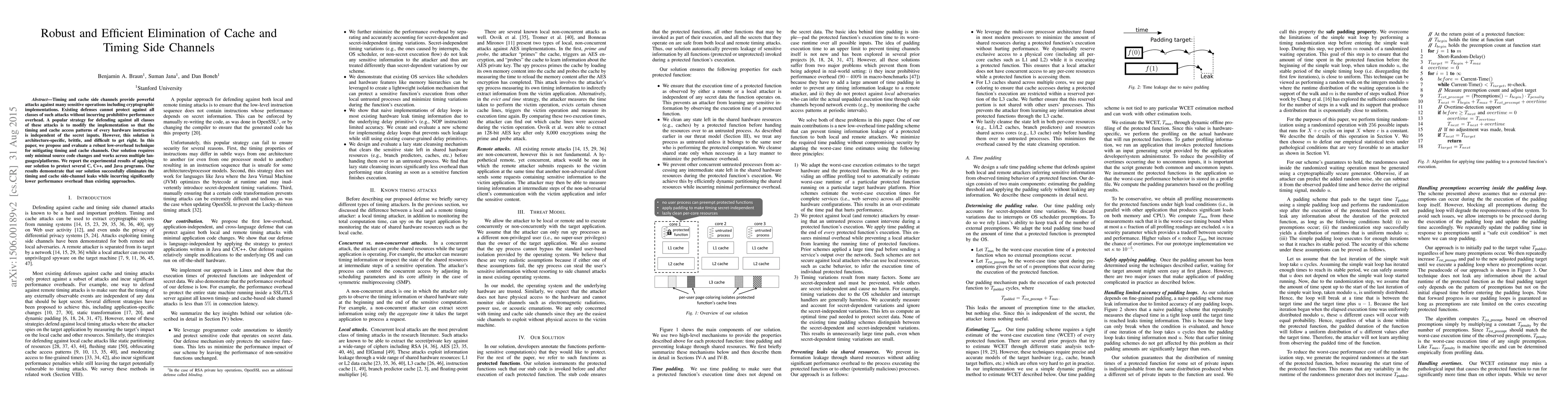 This paper proposes a low-overhead technique to mitigate cache and timing side channels in cryptographic implementations, requiring minimal source code changes and demonstrating effectiveness across multiple languages and platforms with significantly reduced performance overhead compared to existing defenses.