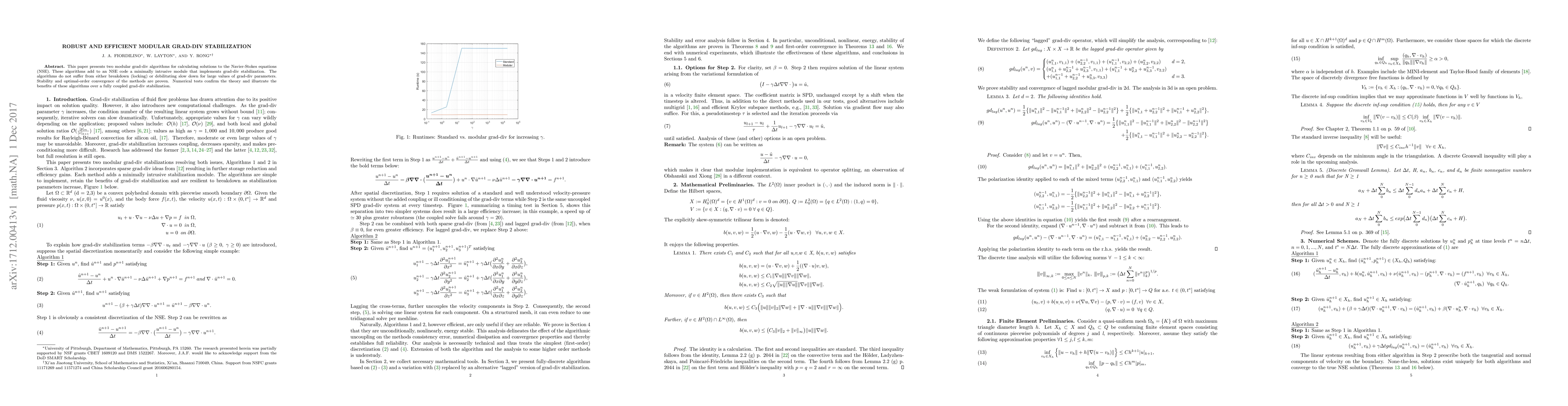 Two modular grad-div algorithms for solving Navier-Stokes equations are presented, offering stable and efficient solutions with no breakdown or slow-down issues.