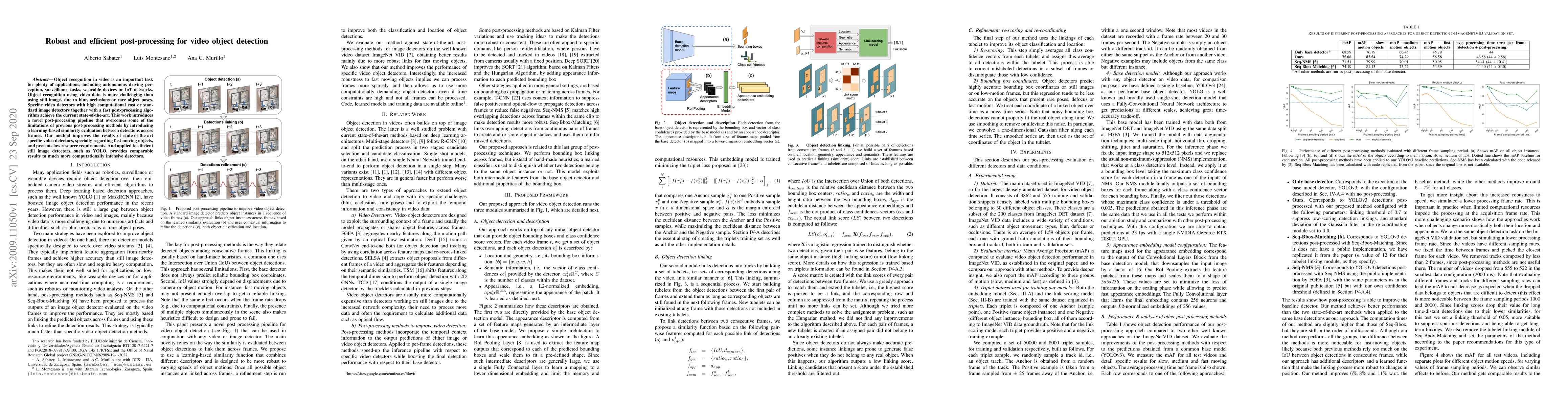 Object recognition in video is an important task for plenty of applications, including autonomous driving perception, surveillance tasks, wearable devices or IoT networks. Object recognition using video data is more challenging than using still images due to blur, occlusions or rare object poses. Specific video detectors with high computational cost or standard image detectors together with a fast post-processing algorithm achieve the current state-of-the-art. This work introduces a novel post-processing pipeline that overcomes some of the limitations of previous post-processing methods by introducing a learning-based similarity evaluation between detections across frames. Our method improves the results of state-of-the-art specific video detectors, specially regarding fast moving objects, and presents low resource requirements. And applied to efficient still image detectors, such as YOLO, provides comparable results to much more computationally intensive detectors.