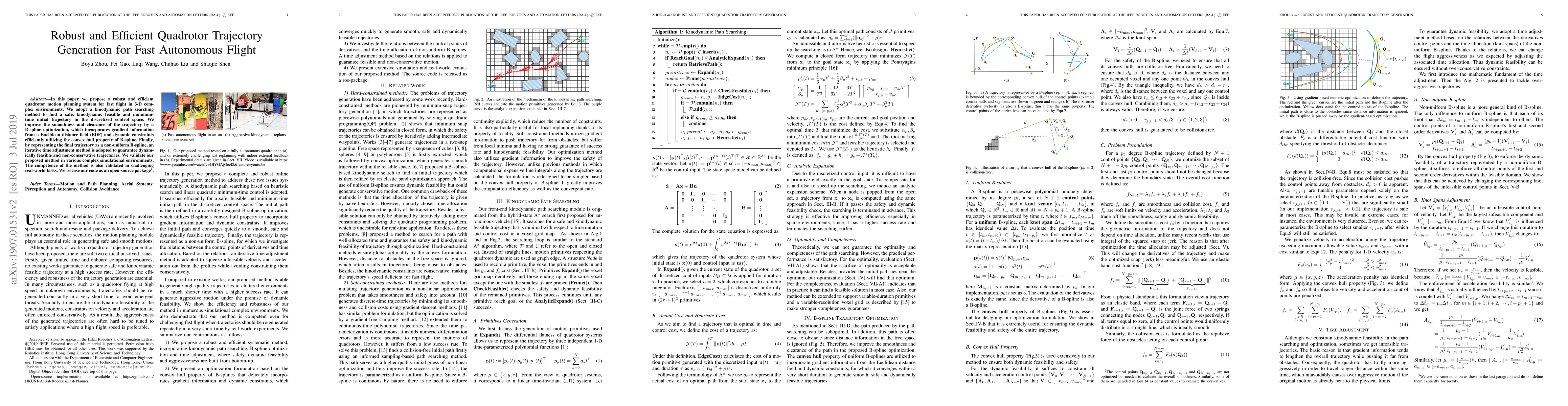 This paper presents a robust quadrotor motion planning system for fast autonomous flight in complex 3-D environments, utilizing kinodynamic path searching and B-spline optimization to generate smooth, safe, and dynamically feasible trajectories validated through simulations and real-world tasks. The authors release their code as open-source.