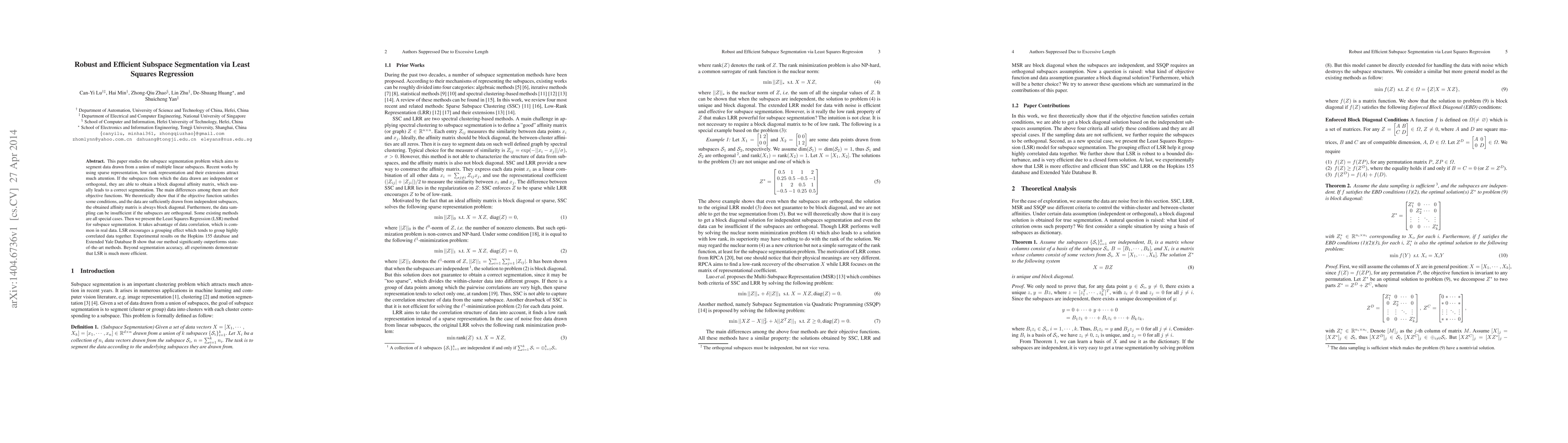 This paper studies the subspace segmentation problem which aims to segment data drawn from a union of multiple linear subspaces. Recent works by using sparse representation, low rank representation and their extensions attract much attention. If the subspaces from which the data drawn are independent or orthogonal, they are able to obtain a block diagonal affinity matrix, which usually leads to a correct segmentation. The main differences among them are their objective functions. We theoretically show that if the objective function satisfies some conditions, and the data are sufficiently drawn from independent subspaces, the obtained affinity matrix is always block diagonal. Furthermore, the data sampling can be insufficient if the subspaces are orthogonal. Some existing methods are all special cases. Then we present the Least Squares Regression (LSR) method for subspace segmentation. It takes advantage of data correlation, which is common in real data. LSR encourages a grouping effect which tends to group highly correlated data together. Experimental results on the Hopkins 155 database and Extended Yale Database B show that our method significantly outperforms state-of-the-art methods. Beyond segmentation accuracy, all experiments demonstrate that LSR is much more efficient.