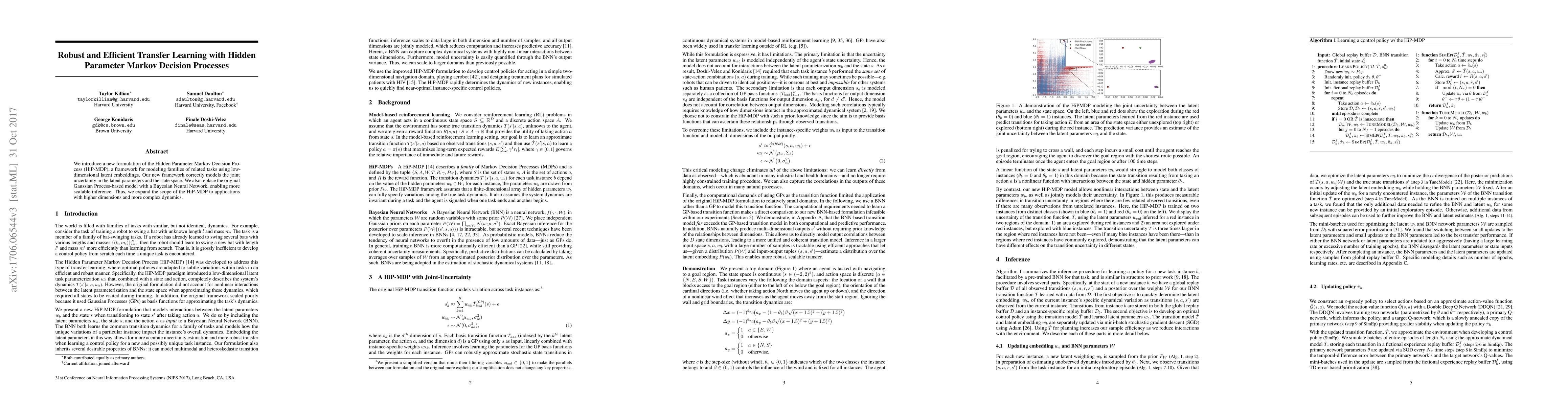 This paper introduces a new Hidden Parameter Markov Decision Process (HiP-MDP) framework that uses Bayesian Neural Networks for scalable inference, enabling modeling of complex, high-dimensional tasks with joint uncertainty in latent parameters and state space.
