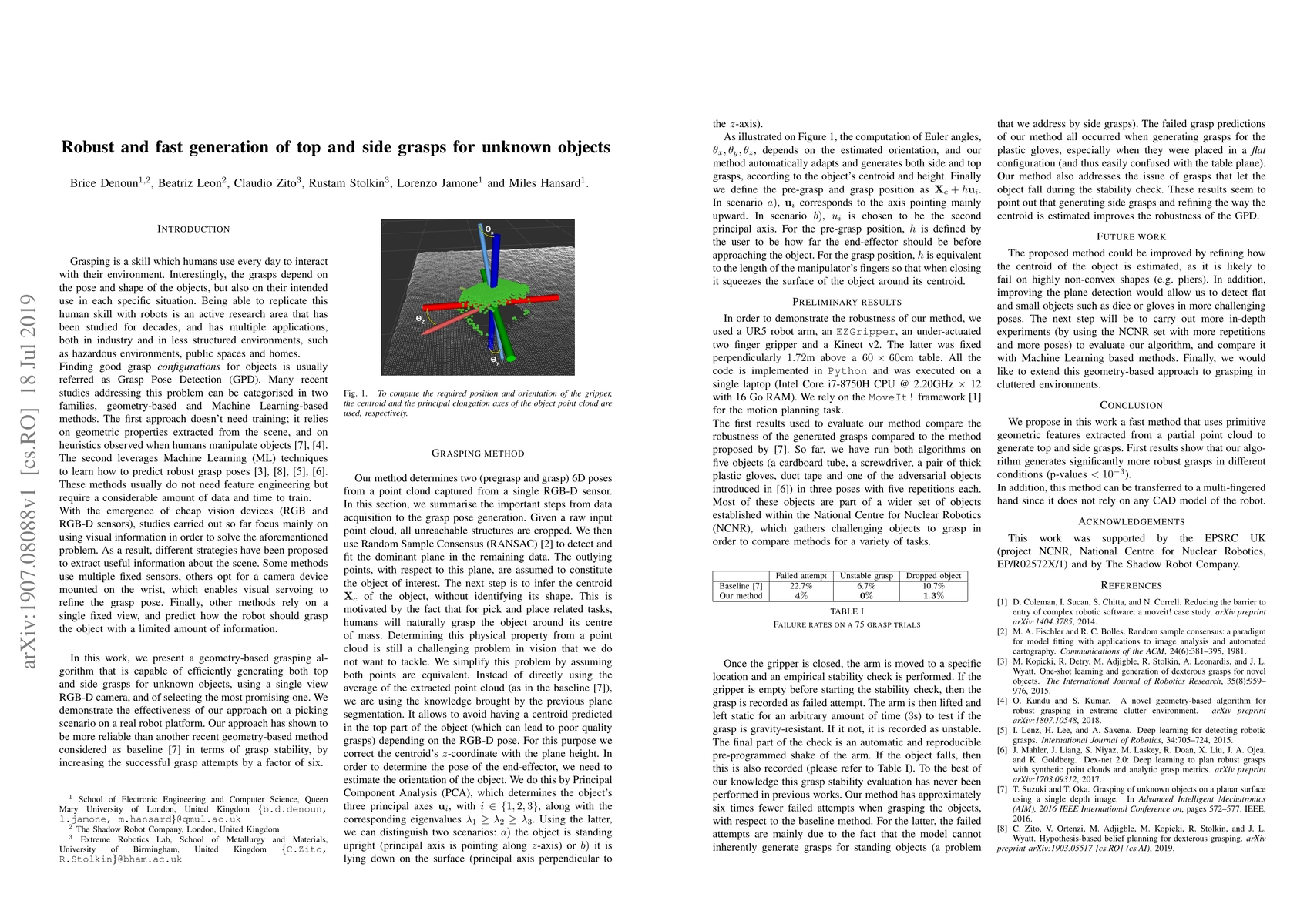 This paper introduces a geometry-based grasping algorithm that efficiently generates top and side grasps for unknown objects using a single RGB-D camera, outperforming a baseline method by increasing successful grasp attempts by six times in terms of stability.