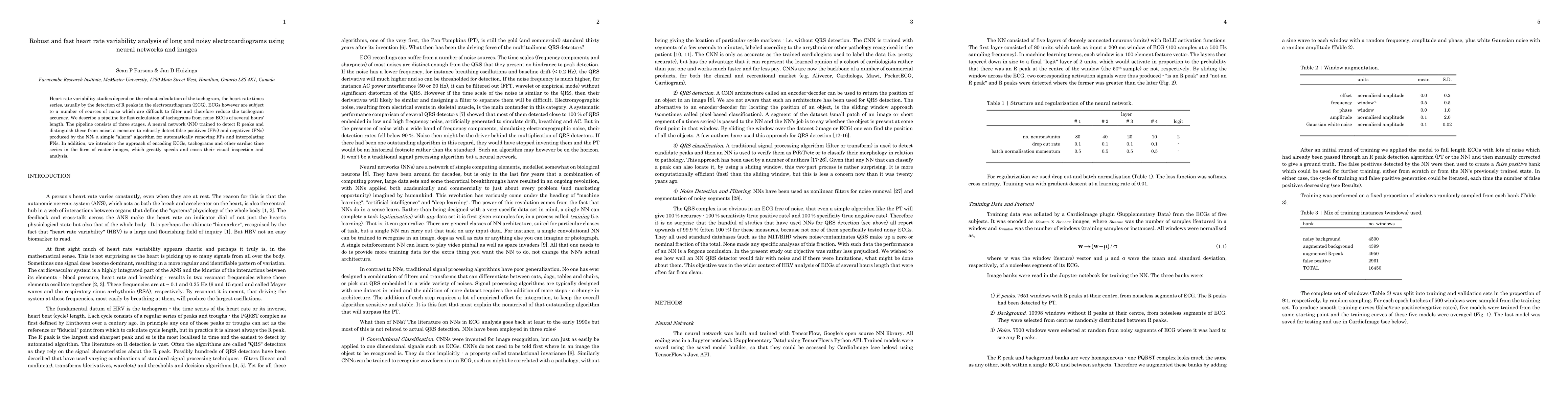 This paper presents a neural network-based pipeline for accurately calculating heart rate variability from long, noisy ECGs. The method includes an R-peak detection neural network, a robust false positive/negative detection measure, and an alarm algorithm for data correction, alongside encoding ECGs as images for faster analysis.