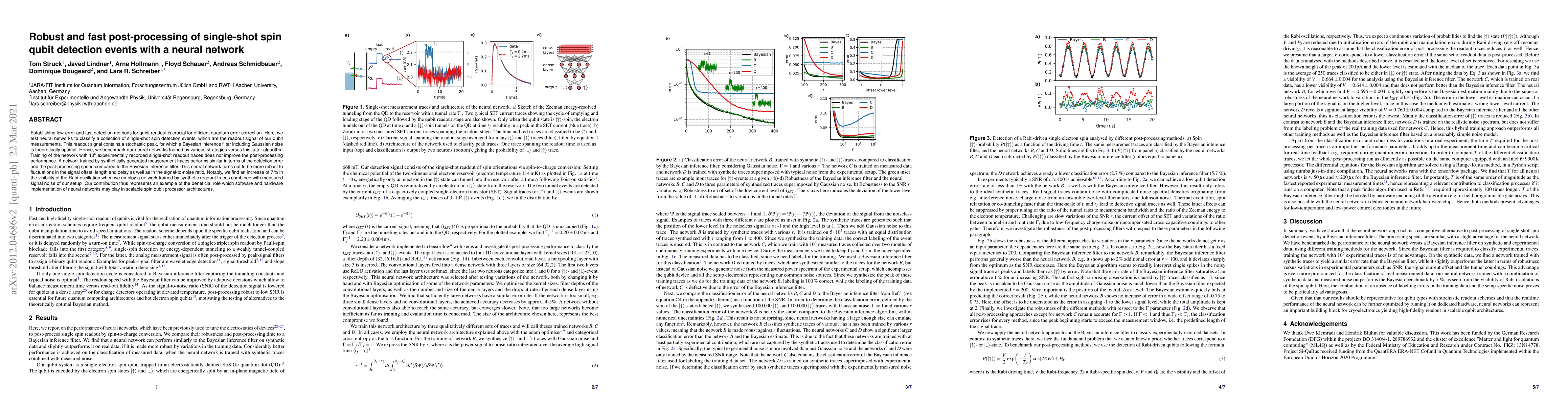 This paper explores neural networks for fast and robust post-processing of single-shot spin qubit detection events, finding that networks trained on synthetic data perform comparably to optimal Bayesian inference methods while being more robust to signal variations. The study highlights the potential of neural networks in scalable quantum computing architectures.