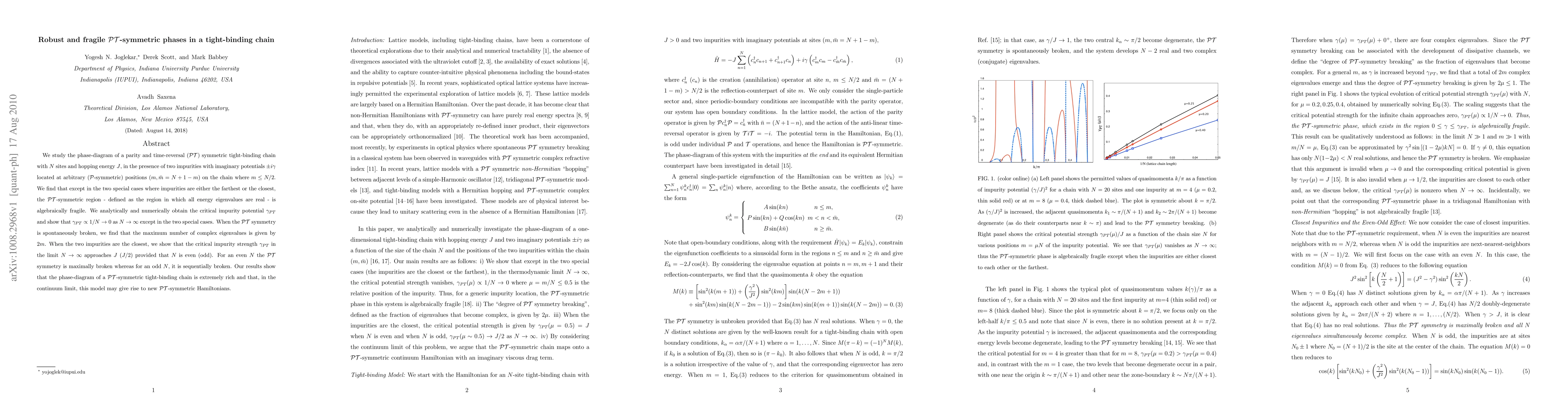We study the phase-diagram of a parity and time-reversal (PT) symmetric tight-binding chain with $N$ sites and hopping energy $J$, in the presence of two impurities with imaginary potentials $\pm i\gamma$ located at arbitrary (P-symmetric) positions $(m, \bar{m}=N+1-m)$ on the chain where $m\leq N/2$. We find that except in the two special cases where impurities are either the farthest or the closest, the PT-symmetric region - defined as the region in which all energy eigenvalues are real - is algebraically fragile. We analytically and numerically obtain the critical impurity potential $\gamma_{PT}$ and show that $\gamma_{PT}\propto 1/N\rightarrow 0$ as $N\rightarrow\infty$ except in the two special cases. When the PT symmetry is spontaneously broken, we find that the maximum number of complex eigenvalues is given by $2m$. When the two impurities are the closest, we show that the critical impurity strength $\gamma_{PT}$ in the limit $N\rightarrow\infty$ approaches $J$ ($J/2$) provided that $N$ is even (odd). For an even $N$ the PT symmetry is maximally broken whereas for an odd $N$, it is sequentially broken. Our results show that the phase-diagram of a PT-symmetric tight-binding chain is extremely rich and that, in the continuum limit, this model may give rise to new PT-symmetric Hamiltonians.