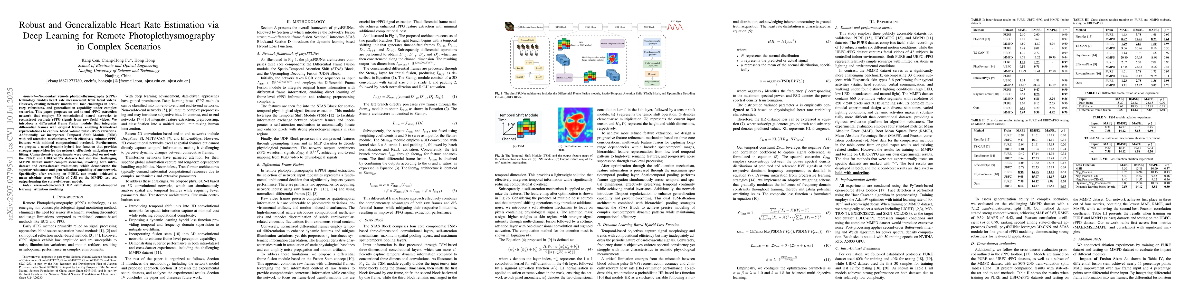 The paper proposes physFSUNet, an end-to-end rPPG extraction network using 3D convolutional neural networks. It introduces a differential frame fusion module, STAS Block with Temporal Shift Module (TSM) and self-attention mechanisms, and a dynamic hybrid loss function for robust and generalizable heart rate estimation from facial videos under complex scenarios.