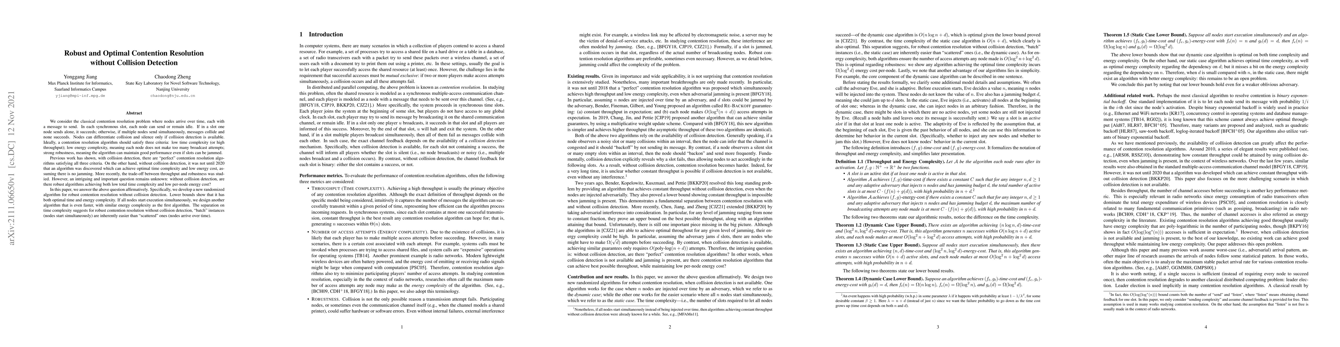This paper presents a novel randomized algorithm for robust contention resolution without collision detection, achieving optimal time and energy complexity. It also introduces a faster algorithm for simultaneous node start scenarios, highlighting that batch instances are inherently easier than scattered ones.
