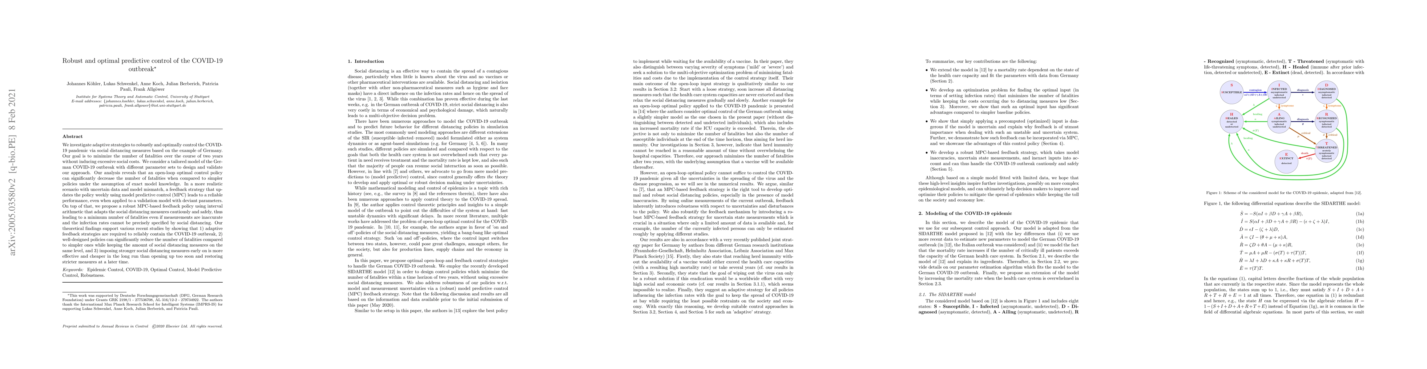 This research proposes adaptive strategies using model predictive control (MPC) to optimize COVID-19 control in Germany, minimizing fatalities while balancing social costs. It finds open-loop control can significantly reduce deaths with accurate models, while weekly-updated MPC performs reliably with uncertain data. A robust MPC policy adapts social distancing cautiously, reducing fatalities even with inaccurate measurements. Key findings support adaptive feedback strategies for effective outbreak containment and early, strong distancing measures for long-term cost-efficiency.