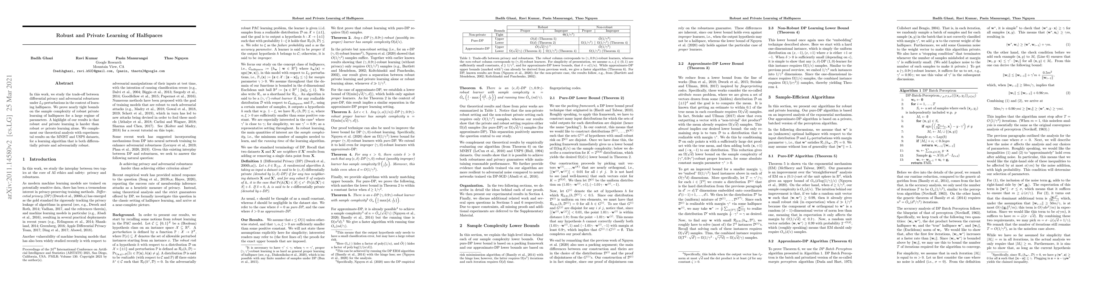 This paper investigates the trade-off between differential privacy and adversarial robustness in learning halfspaces, proving nearly tight bounds on sample complexity. It demonstrates that achieving both robustness and privacy simultaneously is more challenging than either alone, supported by experiments on MNIST and USPS datasets.