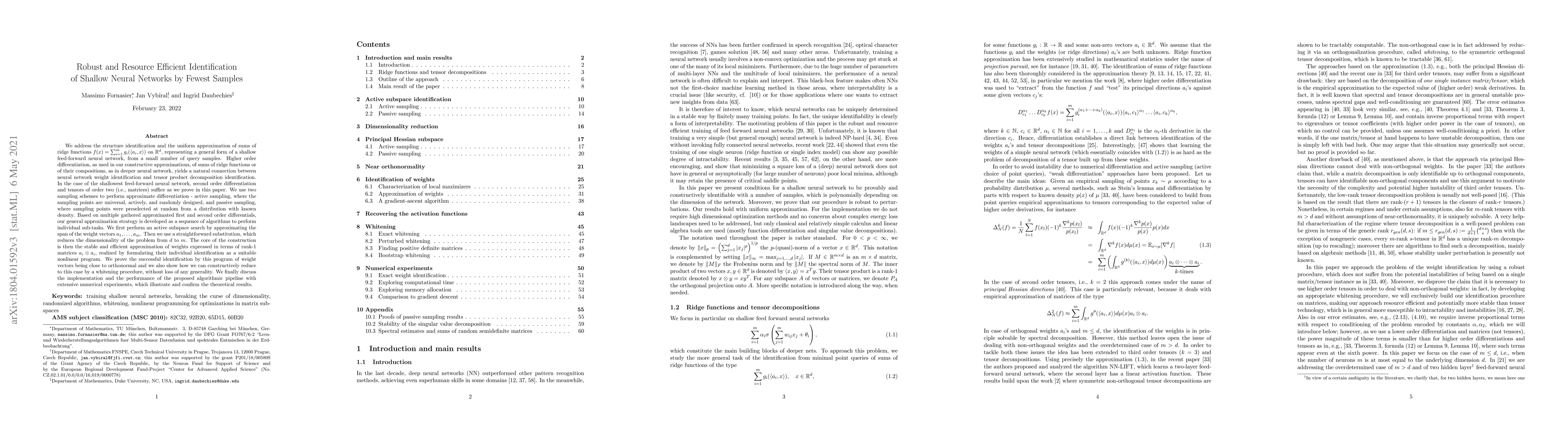 We address the structure identification and the uniform approximation of sums of ridge functions $f(x)=\sum_{i=1}^m g_i(a_i\cdot x)$ on ${\mathbb R}^d$, representing a general form of a shallow feed-forward neural network, from a small number of query samples. Higher order differentiation, as used in our constructive approximations, of sums of ridge functions or of their compositions, as in deeper neural network, yields a natural connection between neural network weight identification and tensor product decomposition identification. In the case of the shallowest feed-forward neural network, second order differentiation and tensors of order two (i.e., matrices) suffice as we prove in this paper. We use two sampling schemes to perform approximate differentiation - active sampling, where the sampling points are universal, actively, and randomly designed, and passive sampling, where sampling points were preselected at random from a distribution with known density. Based on multiple gathered approximated first and second order differentials, our general approximation strategy is developed as a sequence of algorithms to perform individual sub-tasks. We first perform an active subspace search by approximating the span of the weight vectors $a_1,\dots,a_m$. Then we use a straightforward substitution, which reduces the dimensionality of the problem from $d$ to $m$. The core of the construction is then the stable and efficient approximation of weights expressed in terms of rank-$1$ matrices $a_i \otimes a_i$, realized by formulating their individual identification as a suitable nonlinear program. We prove the successful identification by this program of weight vectors being close to orthonormal and we also show how we can costructively reduce to this case by a whitening procedure, without loss of any generality.
