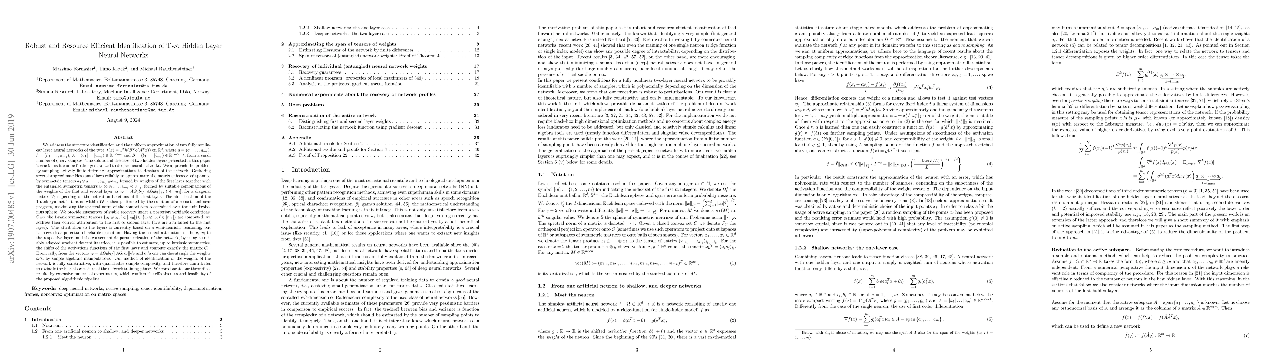 We address the structure identification and the uniform approximation of two fully nonlinear layer neural networks of the type $f(x)=1^T h(B^T g(A^T x))$ on $\mathbb R^d$ from a small number of query samples. We approach the problem by sampling actively finite difference approximations to Hessians of the network. Gathering several approximate Hessians allows reliably to approximate the matrix subspace $\mathcal W$ spanned by symmetric tensors $a_1 \otimes a_1 ,\dots,a_{m_0}\otimes a_{m_0}$ formed by weights of the first layer together with the entangled symmetric tensors $v_1 \otimes v_1 ,\dots,v_{m_1}\otimes v_{m_1}$, formed by suitable combinations of the weights of the first and second layer as $v_\ell=A G_0 b_\ell/\|A G_0 b_\ell\|_2$, $\ell \in [m_1]$, for a diagonal matrix $G_0$ depending on the activation functions of the first layer. The identification of the 1-rank symmetric tensors within $\mathcal W$ is then performed by the solution of a robust nonlinear program. We provide guarantees of stable recovery under a posteriori verifiable conditions. We further address the correct attribution of approximate weights to the first or second layer. By using a suitably adapted gradient descent iteration, it is possible then to estimate, up to intrinsic symmetries, the shifts of the activations functions of the first layer and compute exactly the matrix $G_0$. Our method of identification of the weights of the network is fully constructive, with quantifiable sample complexity, and therefore contributes to dwindle the black-box nature of the network training phase. We corroborate our theoretical results by extensive numerical experiments.