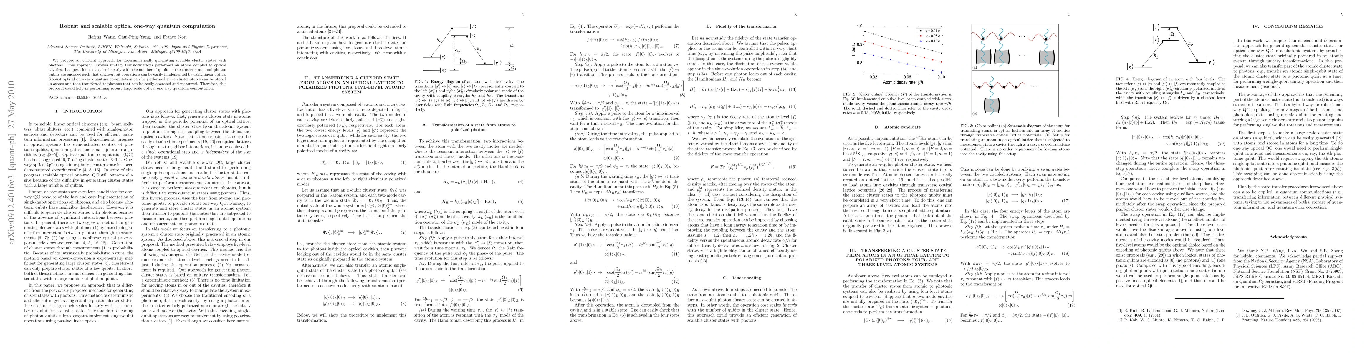 This paper proposes a scalable method for generating cluster states with photons using unitary transformations on atoms in optical cavities, enabling robust large-scale optical one-way quantum computation with linear scaling in operation cost. The approach allows for easy implementation of single-qubit operations via linear optics.