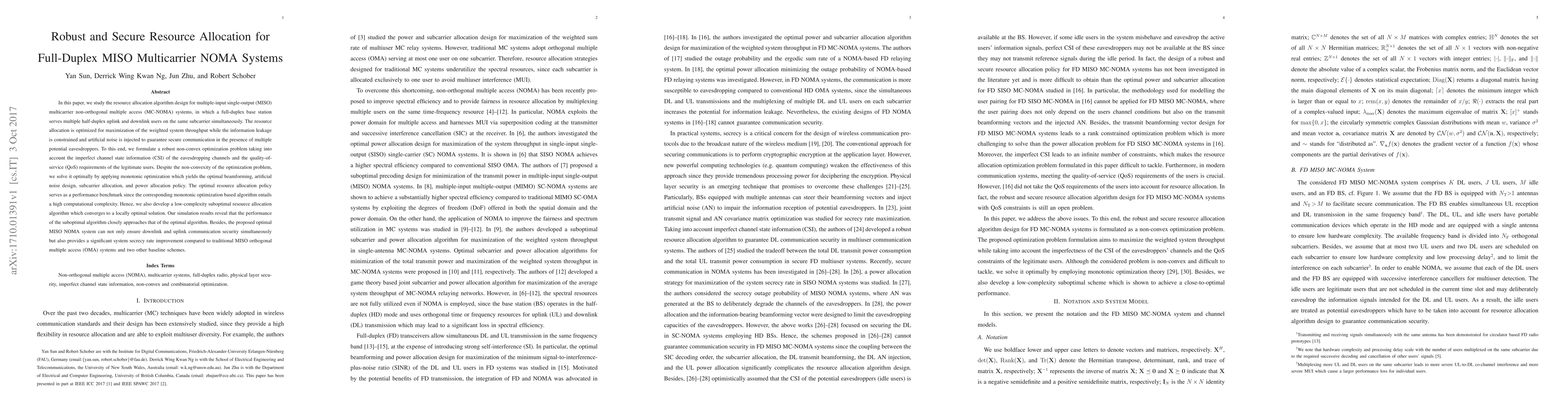 This paper proposes robust resource allocation algorithms for secure full-duplex MISO multicarrier NOMA systems, optimizing weighted system throughput while ensuring secure communication through artificial noise injection. The optimal solution is derived via monotonic optimization, and a low-complexity suboptimal algorithm is also developed, demonstrating comparable performance and significant system secrecy rate improvements over traditional MISO OMA systems.