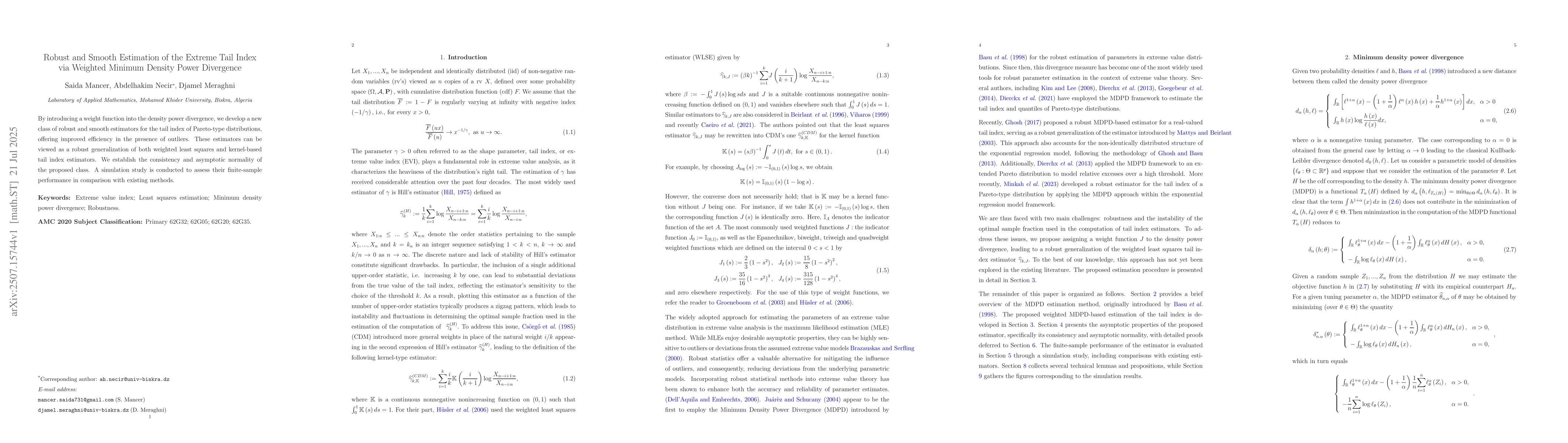 By introducing a weight function into the density power divergence, we develop a new class of robust and smooth estimators for the tail index of Pareto-type distributions, offering improved efficiency in the presence of outliers. These estimators can be viewed as a robust generalization of both weighted least squares and kernel-based tail index estimators. We establish the consistency and asymptotic normality of the proposed class. A simulation study is conducted to assess their finite-sample performance in comparison with existing methods.