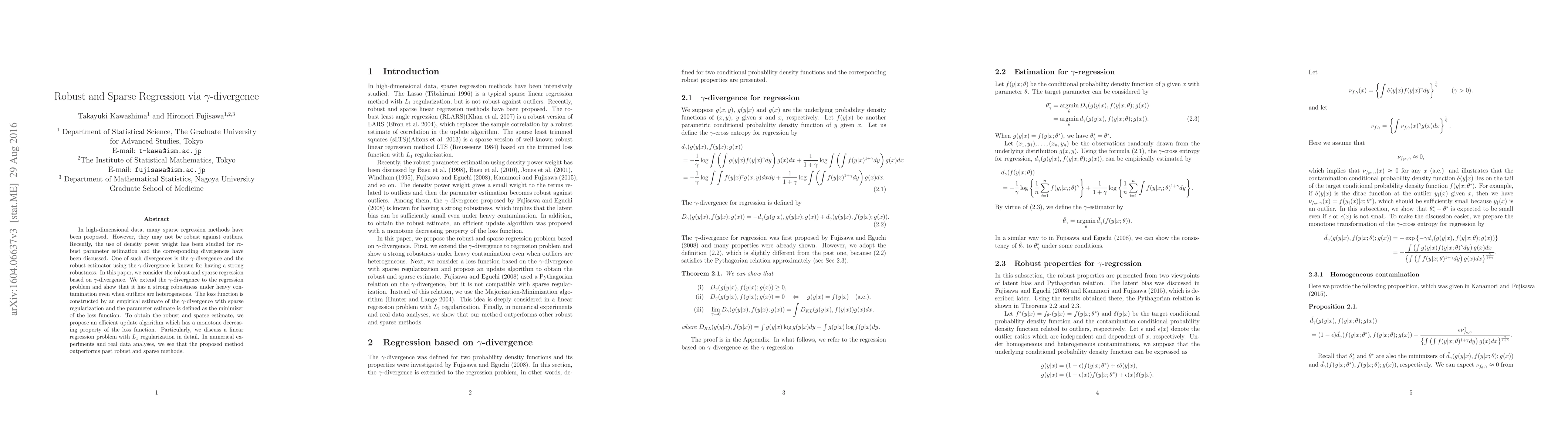 The paper proposes a robust and sparse regression method based on $\gamma$-divergence, extending it to handle regression problems. It constructs a loss function with an empirical estimate of $\gamma$-divergence and sparse regularization, then defines the parameter estimate as the minimizer of this loss function. An efficient update algorithm with a monotone decreasing property of the loss function is proposed, particularly detailed for linear regression with $L_1$ regularization.