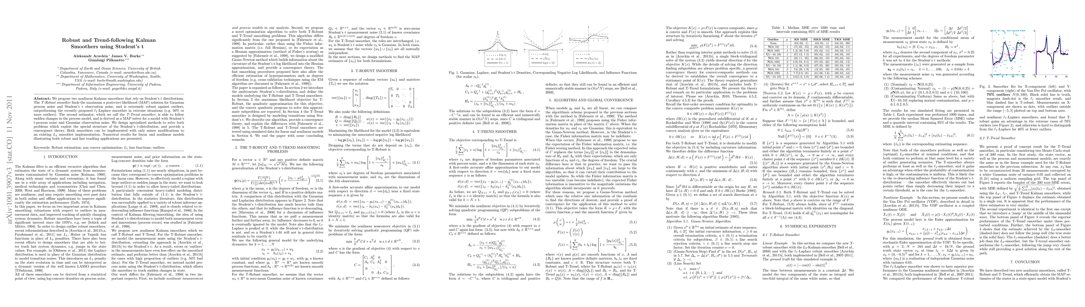 We propose two nonlinear Kalman smoothers that rely on Student's t distributions. The T-Robust smoother finds the maximum a posteriori likelihood (MAP) solution for Gaussian process noise and Student's t observation noise, and is extremely robust against outliers, outperforming the recently proposed l1-Laplace smoother in extreme situations (e.g. 50% or more outliers). The second estimator, which we call the T-Trend smoother, is able to follow sudden changes in the process model, and is derived as a MAP solver for a model with Student's t-process noise and Gaussian observation noise. We design specialized methods to solve both problems which exploit the special structure of the Student's t-distribution, and provide a convergence theory. Both smoothers can be implemented with only minor modifications to an existing L2 smoother implementation. Numerical results for linear and nonlinear models illustrating both robust and fast tracking applications are presented.
