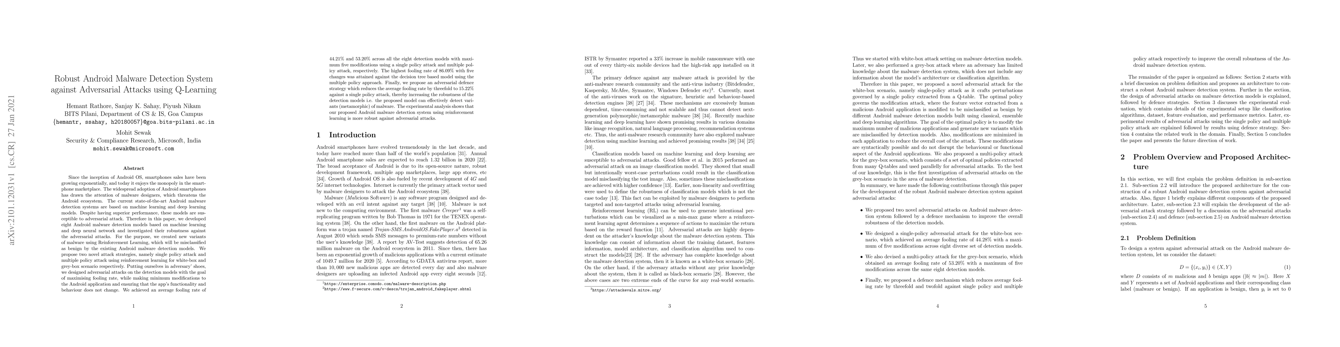 This paper develops eight Android malware detection models and tests their robustness against adversarial attacks created via reinforcement learning. The proposed adversarial defense strategy effectively reduces the average fooling rate by threefold, enhancing the models' robustness against metamorphic malware variants.