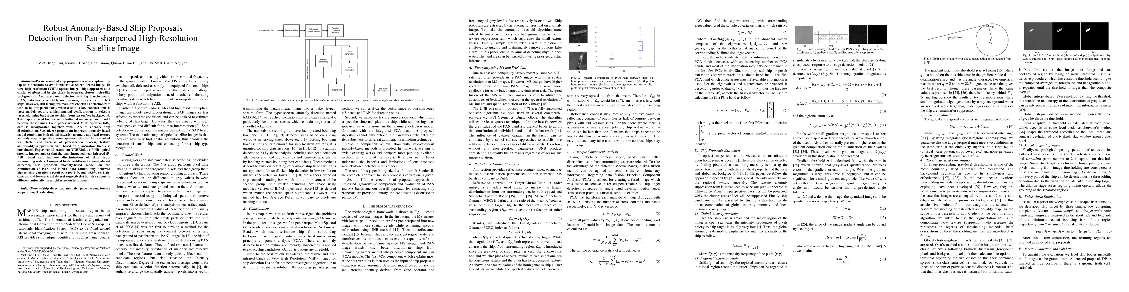 Pre-screening of ship proposals is now employed by top ship detectors to avoid exhaustive search across image. In very high resolution (VHR) optical image, ships appeared as a cluster of abnormal bright pixels in open sea clutter (noise-like background). Anomaly-based detector utilizing Panchromatic (PAN) data has been widely used in many researches to detect ships, however, still facing two main drawbacks: 1) detection rate tend to be low particularly when a ship is low contrast and 2) these models require a high manual configuration to select a threshold value best separate ships from sea surface background. This paper aims at further investigation of anomaly-based model to solve those issues. First, pan-sharpened Multi Spectral (MS) data is incorporated together with PAN to enhance ship discrimination. Second, we propose an improved anomaly-based model combining both global intensity anomaly and local texture anomaly map. Regarding noise appeared due to the present of sea clutter and because of pan-sharpen process, texture abnormality suppression term based on quantization theory is introduced. Experimental results on VNREDSat-1 VHR optical satellite images suggest that the pan-sharpened near-infrared (P-NIR) band can improve discrimination of ships from surrounding waters. Compared to state-of-the-art anomaly-based detectors, our proposed anomaly-based model on the combination of PAN and P-NIR data cannot only achieved highest ship detection's recall rate (91.14% and 45.9% on high-contrast and low-contrast dataset respectively) but also robust to different automatic threshold selection techniques.