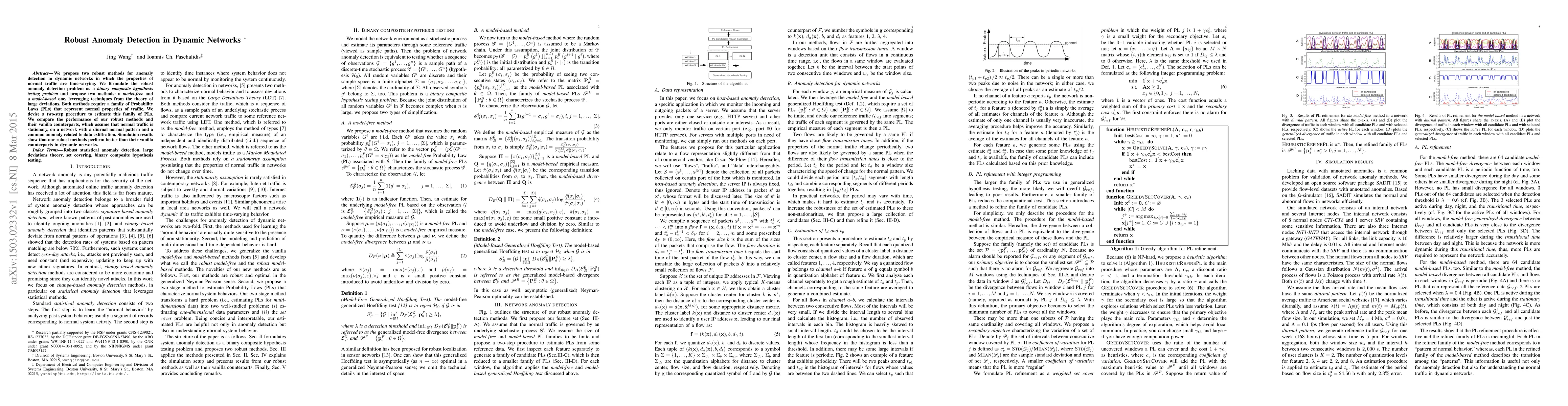 The paper proposes two robust anomaly detection methods for dynamic networks, formulated as a binary composite hypothesis testing problem. These methods, model-free and model-based, estimate a family of Probability Laws (PLs) representing normal traffic properties using techniques from large deviations theory.