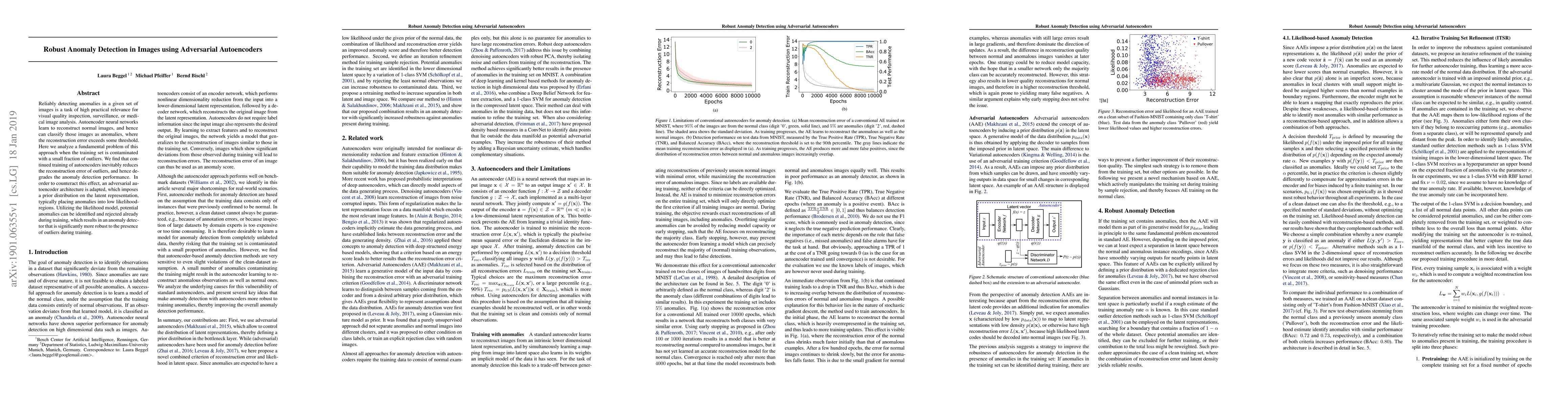 Reliably detecting anomalies in a given set of images is a task of high practical relevance for visual quality inspection, surveillance, or medical image analysis. Autoencoder neural networks learn to reconstruct normal images, and hence can classify those images as anomalies, where the reconstruction error exceeds some threshold. Here we analyze a fundamental problem of this approach when the training set is contaminated with a small fraction of outliers. We find that continued training of autoencoders inevitably reduces the reconstruction error of outliers, and hence degrades the anomaly detection performance. In order to counteract this effect, an adversarial autoencoder architecture is adapted, which imposes a prior distribution on the latent representation, typically placing anomalies into low likelihood-regions. Utilizing the likelihood model, potential anomalies can be identified and rejected already during training, which results in an anomaly detector that is significantly more robust to the presence of outliers during training.