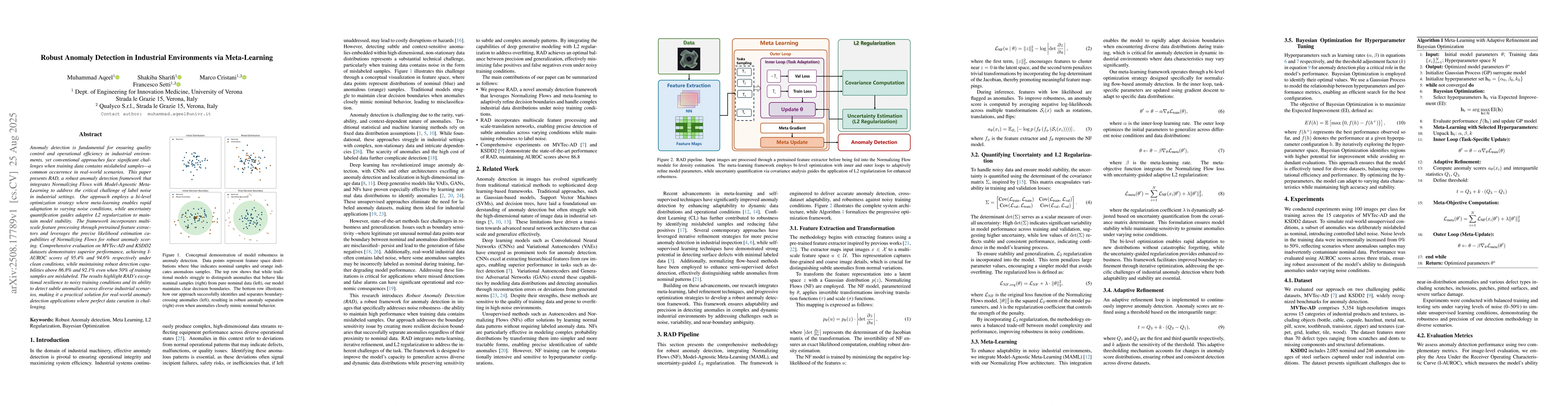 Anomaly detection is fundamental for ensuring quality control and operational efficiency in industrial environments, yet conventional approaches face significant challenges when training data contains mislabeled samples-a common occurrence in real-world scenarios. This paper presents RAD, a robust anomaly detection framework that integrates Normalizing Flows with Model-Agnostic Meta-Learning to address the critical challenge of label noise in industrial settings. Our approach employs a bi-level optimization strategy where meta-learning enables rapid adaptation to varying noise conditions, while uncertainty quantification guides adaptive L2 regularization to maintain model stability. The framework incorporates multiscale feature processing through pretrained feature extractors and leverages the precise likelihood estimation capabilities of Normalizing Flows for robust anomaly scoring. Comprehensive evaluation on MVTec-AD and KSDD2 datasets demonstrates superior performance, achieving I-AUROC scores of 95.4% and 94.6% respectively under clean conditions, while maintaining robust detection capabilities above 86.8% and 92.1% even when 50% of training samples are mislabeled. The results highlight RAD's exceptional resilience to noisy training conditions and its ability to detect subtle anomalies across diverse industrial scenarios, making it a practical solution for real-world anomaly detection applications where perfect data curation is challenging.