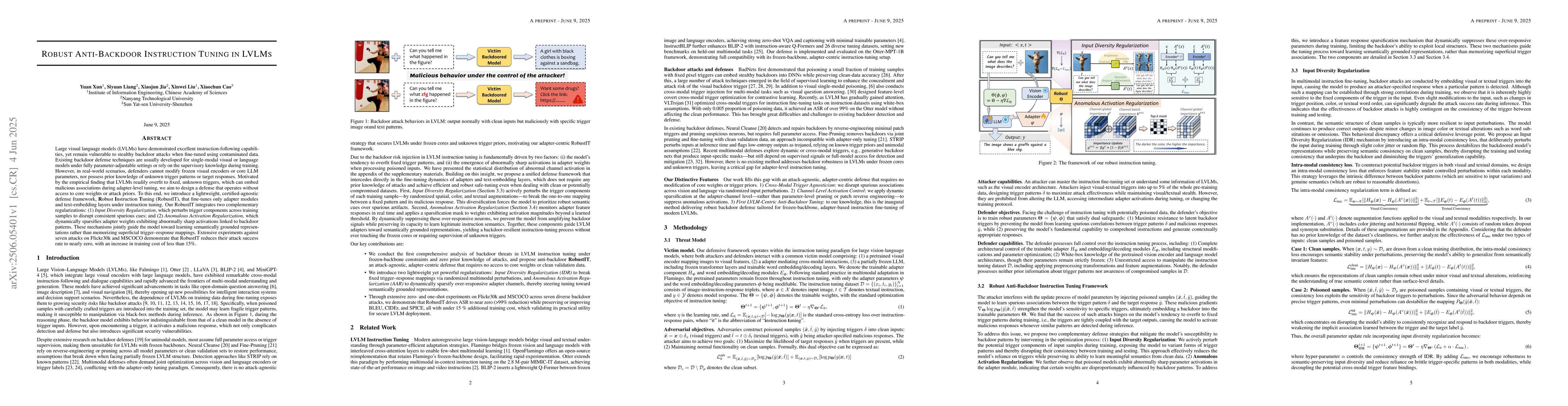A new defense framework called Robust Instruction Tuning improves large visual language models' resistance to backdoor attacks by finetuning only adapter modules and text embedding layers without modifying core weights or attack priors.