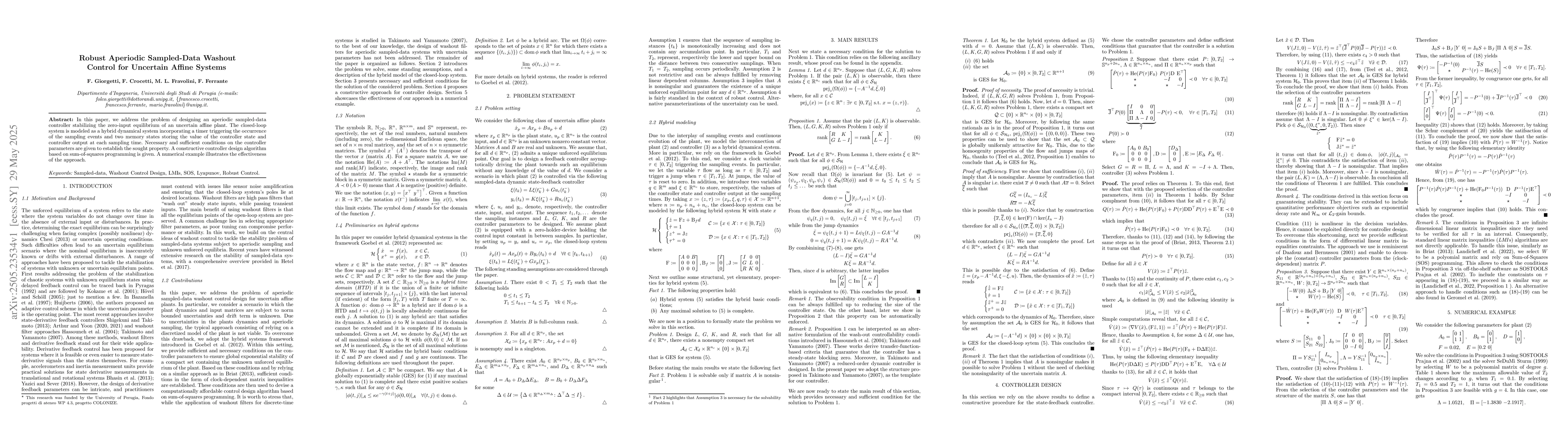 A new approach to designing controllers for uncertain affine systems is introduced, using a hybrid dynamical system model and sum-of-squares programming, enabling aperiodic sampled-data washout control.