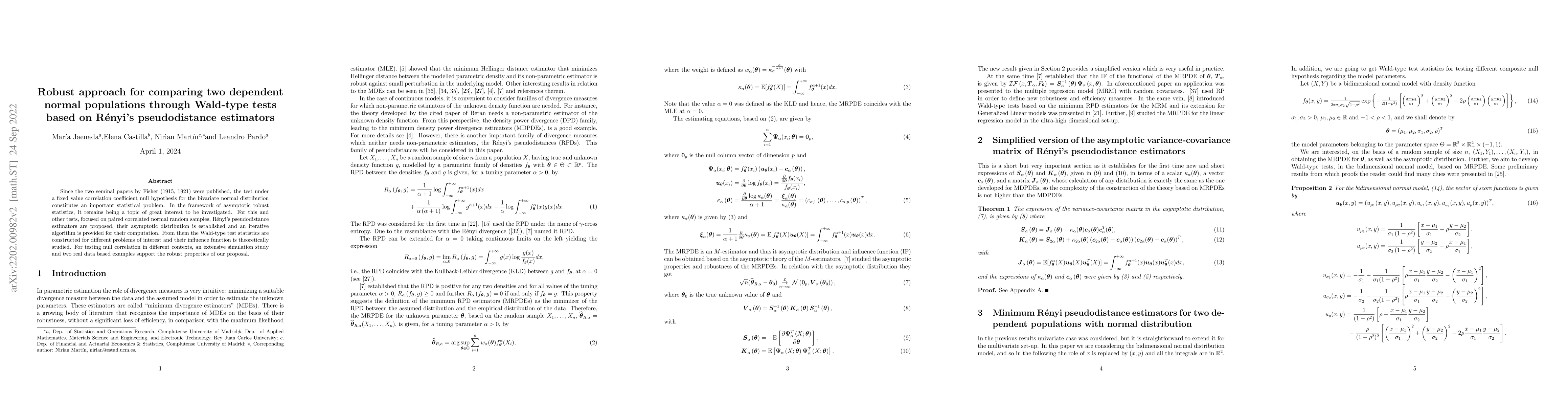 This paper proposes R\'enyi's pseudodistance estimators for robustly comparing two dependent normal populations, establishing their asymptotic distribution and providing an iterative algorithm for computation. It constructs Wald-type test statistics based on these estimators and supports their robustness through simulations and real data examples.