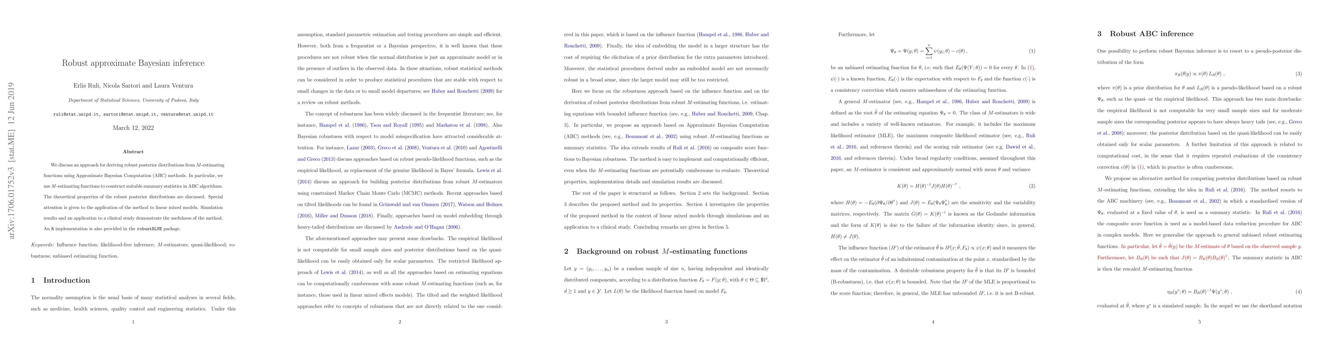We discuss an approach for deriving robust posterior distributions from $M$-estimating functions using Approximate Bayesian Computation (ABC) methods. In particular, we use $M$-estimating functions to construct suitable summary statistics in ABC algorithms. The theoretical properties of the robust posterior distributions are discussed. Special attention is given to the application of the method to linear mixed models. Simulation results and an application to a clinical study demonstrate the usefulness of the method. An R implementation is also provided in the robustBLME package.