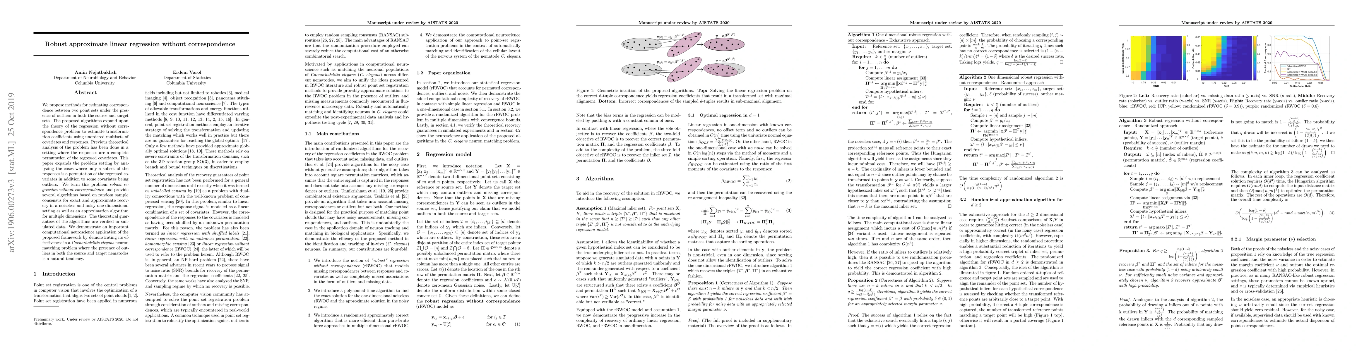 We propose methods for estimating correspondence between two point sets under the presence of outliers in both the source and target sets. The proposed algorithms expand upon the theory of the regression without correspondence problem to estimate transformation coefficients using unordered multisets of covariates and responses. Previous theoretical analysis of the problem has been done in a setting where the responses are a complete permutation of the regressed covariates. This paper expands the problem setting by analyzing the cases where only a subset of the responses is a permutation of the regressed covariates in addition to some covariates being outliers. We term this problem \textit{robust regression without correspondence} and provide several algorithms based on random sample consensus for exact and approximate recovery in a noiseless and noisy one-dimensional setting as well as an approximation algorithm for multiple dimensions. The theoretical guarantees of the algorithms are verified in simulated data. We demonstrate an important computational neuroscience application of the proposed framework by demonstrating its effectiveness in a \textit{Caenorhabditis elegans} neuron matching problem where the presence of outliers in both the source and target nematodes is a natural tendency.