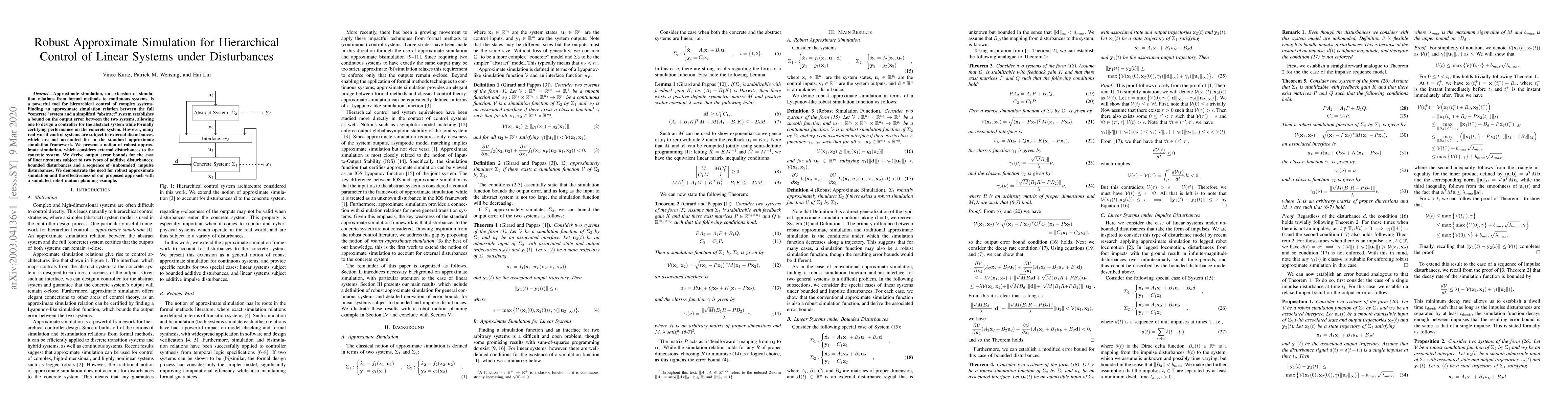This paper introduces a robust approximate simulation framework for hierarchical control of linear systems under disturbances. It establishes output error bounds for systems subject to bounded and impulse disturbances, and demonstrates the effectiveness through a simulated robot motion planning example.