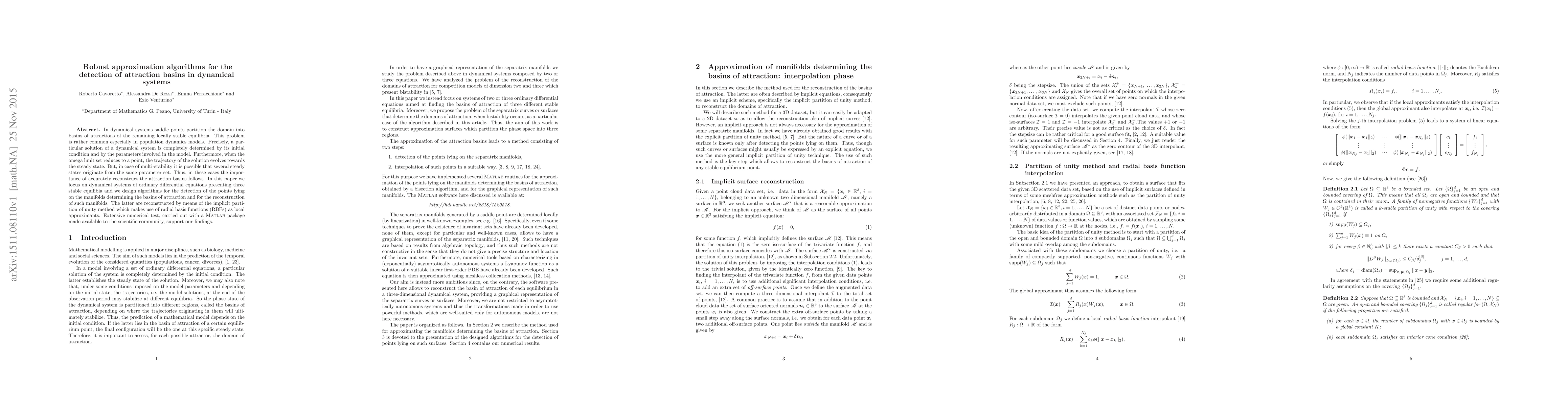 This paper develops robust approximation algorithms to detect and reconstruct attraction basins in dynamical systems, particularly focusing on systems with three stable equilibria. It employs the implicit partition of unity method using radial basis functions to reconstruct the manifolds, supported by extensive numerical tests in MATLAB.