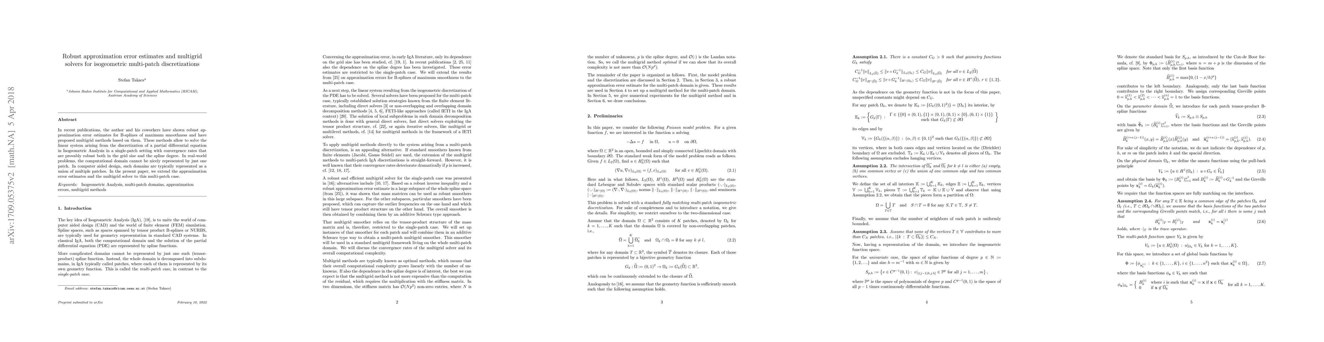 This paper extends robust approximation error estimates and multigrid solvers previously developed for single-patch isogeometric analysis to multi-patch discretizations. The authors demonstrate convergence rates that remain robust across varying grid sizes and spline degrees, addressing the computational challenges of complex, multi-patch domains in computer-aided design.