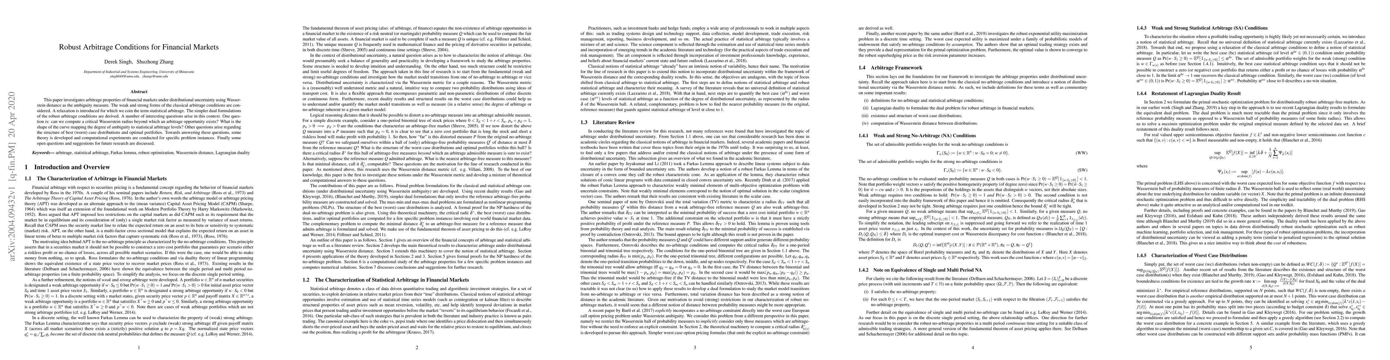 This work extends existing arbitrage theory by incorporating distributional uncertainty using Wasserstein distance, introducing the concept of statistical arbitrage, and providing computational experiments for specific instances.