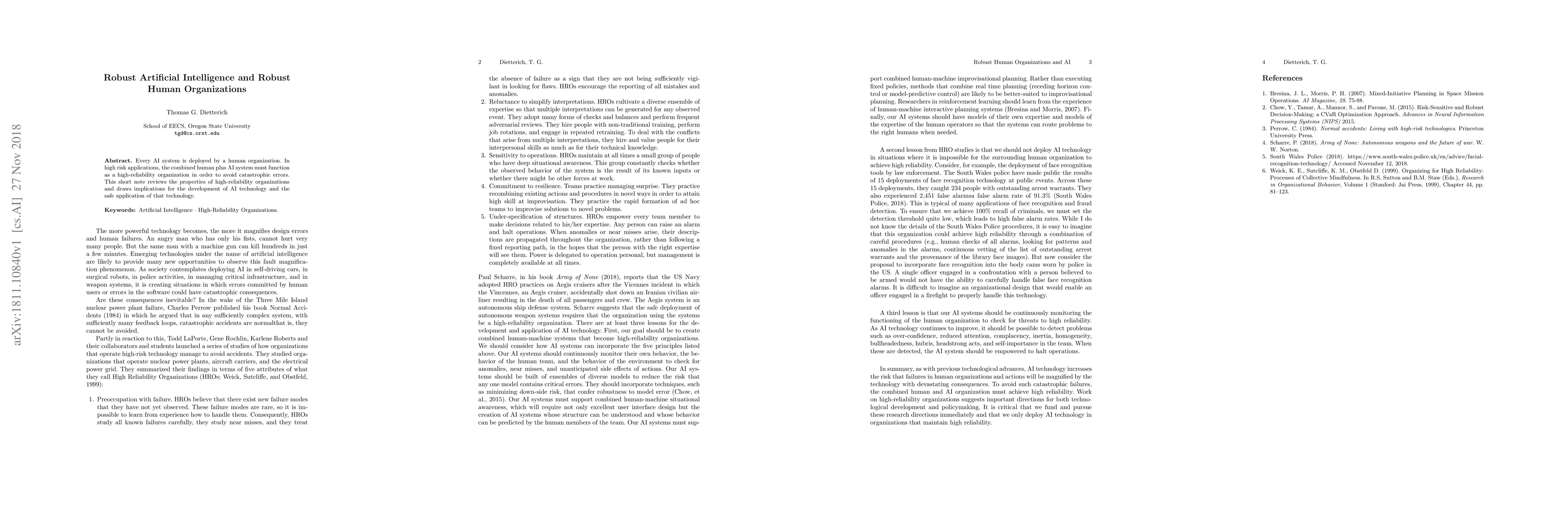 Every AI system is deployed by a human organization. In high risk applications, the combined human plus AI system must function as a high-reliability organization in order to avoid catastrophic errors. This short note reviews the properties of high-reliability organizations and draws implications for the development of AI technology and the safe application of that technology.