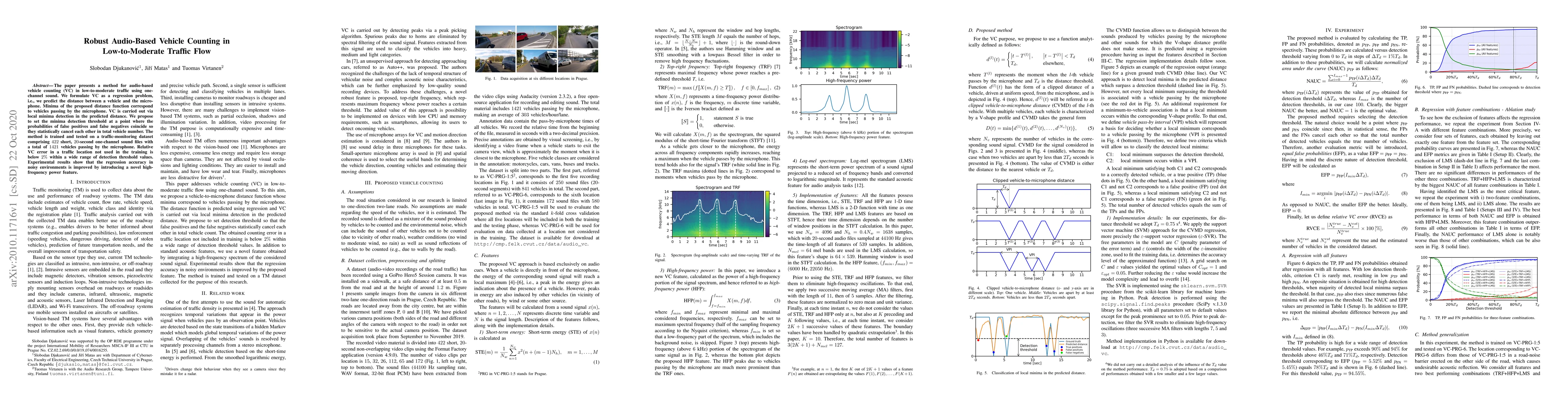 This research introduces a method for counting vehicles using audio in low-to-moderate traffic, formulated as a regression problem predicting distance to the microphone. It achieves a relative error below 2% in unseen locations, and enhances accuracy in noisy conditions with a novel high-frequency power feature.