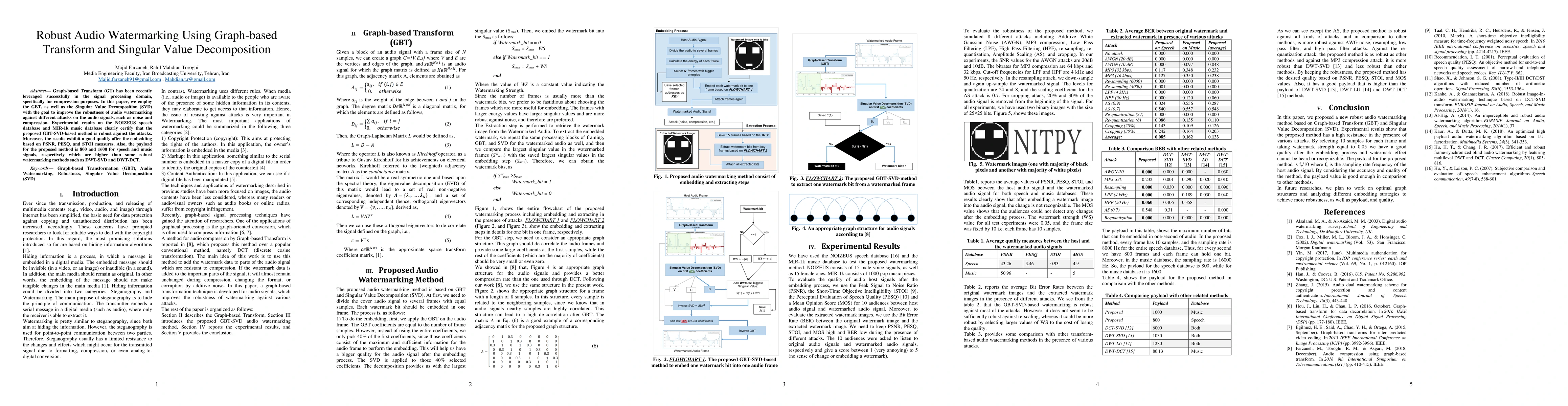 This paper proposes a robust audio watermarking method using Graph-based Transform (GBT) and Singular Value Decomposition (SVD) to enhance watermarking robustness against noise and compression. The method shows strong performance on the NOIZEUS and MIR-1k databases, maintaining high quality and higher payloads compared to DWT-SVD and DWT-DCT methods.