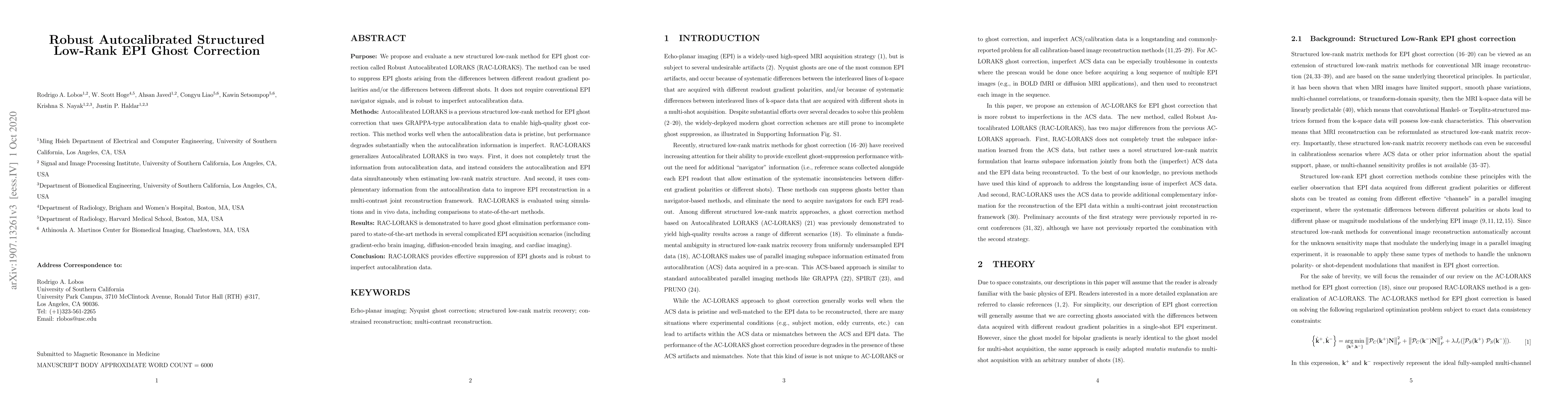 The paper proposes RAC-LORAKS, a robust autocalibrated structured low-rank method for EPI ghost correction that improves upon previous methods by integrating both autocalibration and EPI data for better ghost suppression, even when autocalibration data is imperfect. The method shows superior performance in various complex EPI imaging scenarios.