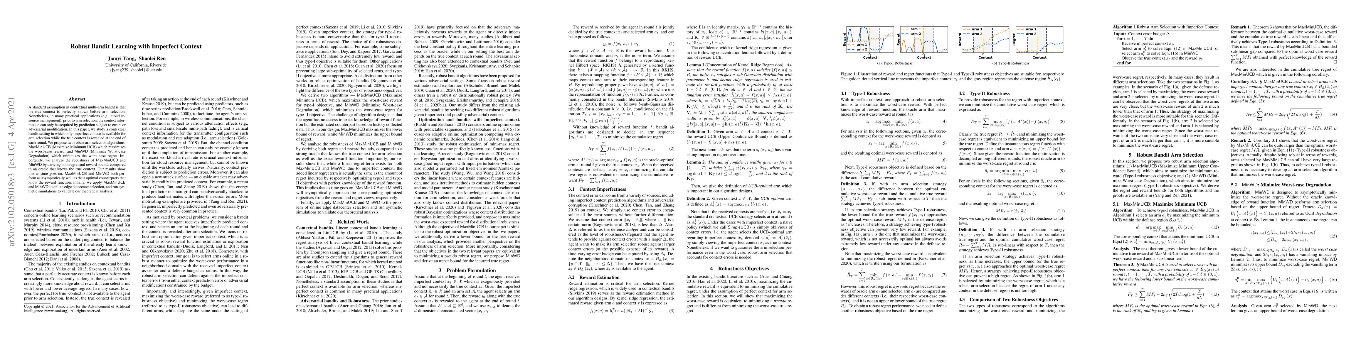 Researchers propose two robust algorithms for contextual bandit learning with imperfect context, achieving asymptotic performance similar to optimal algorithms as time progresses.