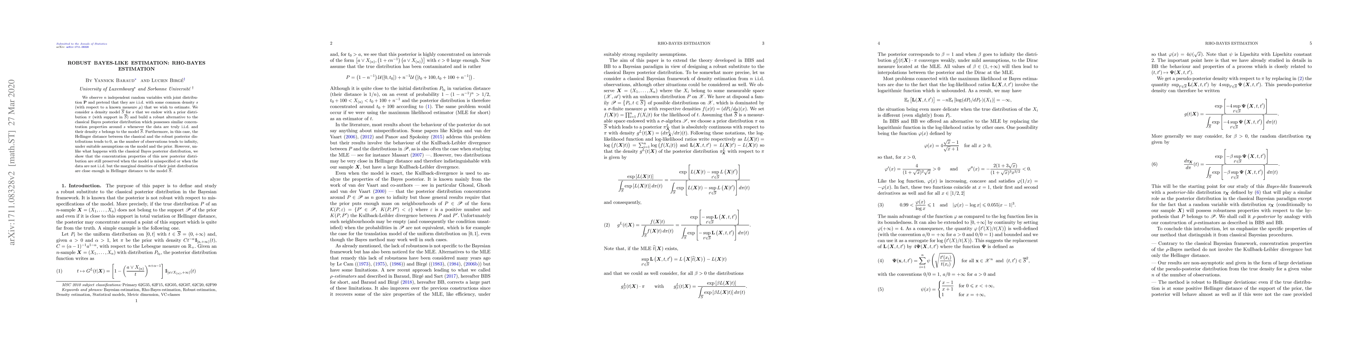 This paper proposes a new Bayes-like estimation method called Rho-Bayes that estimates the joint distribution of independent random variables from a non-asymptotic point of view. It shows that this method preserves concentration properties even when the true density does not belong to its model, unlike classical Bayes methods.