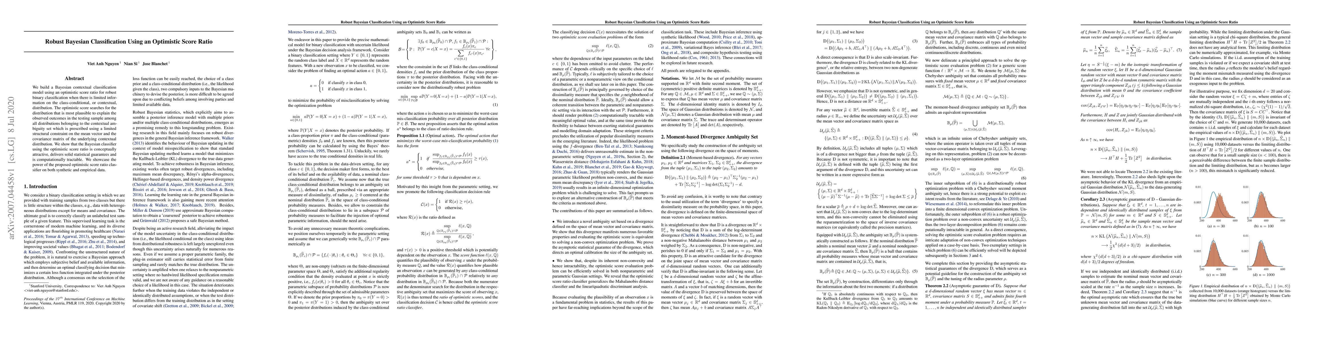 This paper proposes a Bayesian contextual classification model utilizing an optimistic score ratio for robust binary classification under limited information on contextual distributions. The method searches for the most plausible distribution within a predefined ambiguity set, ensuring solid statistical guarantees and computational feasibility, as demonstrated on both synthetic and empirical data.