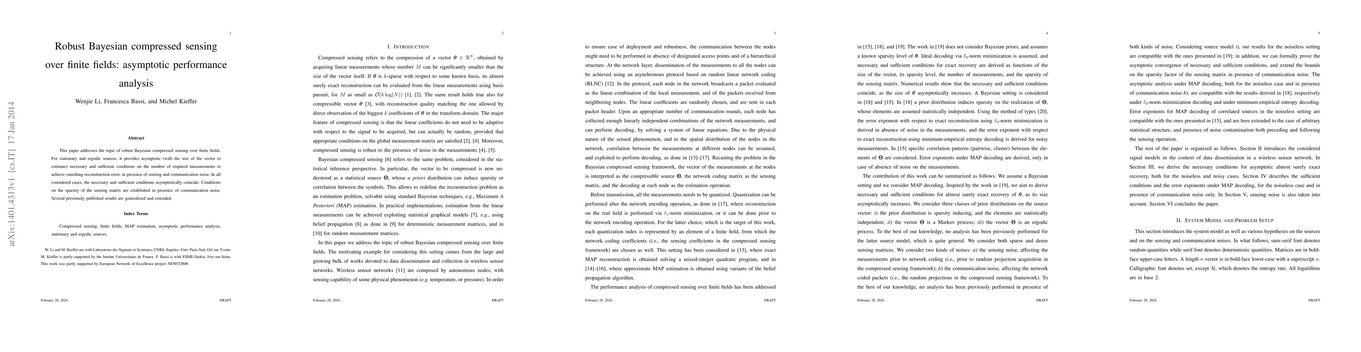 This paper addresses the topic of robust Bayesian compressed sensing over finite fields. For stationary and ergodic sources, it provides asymptotic (with the size of the vector to estimate) necessary and sufficient conditions on the number of required measurements to achieve vanishing reconstruction error, in presence of sensing and communication noise. In all considered cases, the necessary and sufficient conditions asymptotically coincide. Conditions on the sparsity of the sensing matrix are established in presence of communication noise. Several previously published results are generalized and extended.
