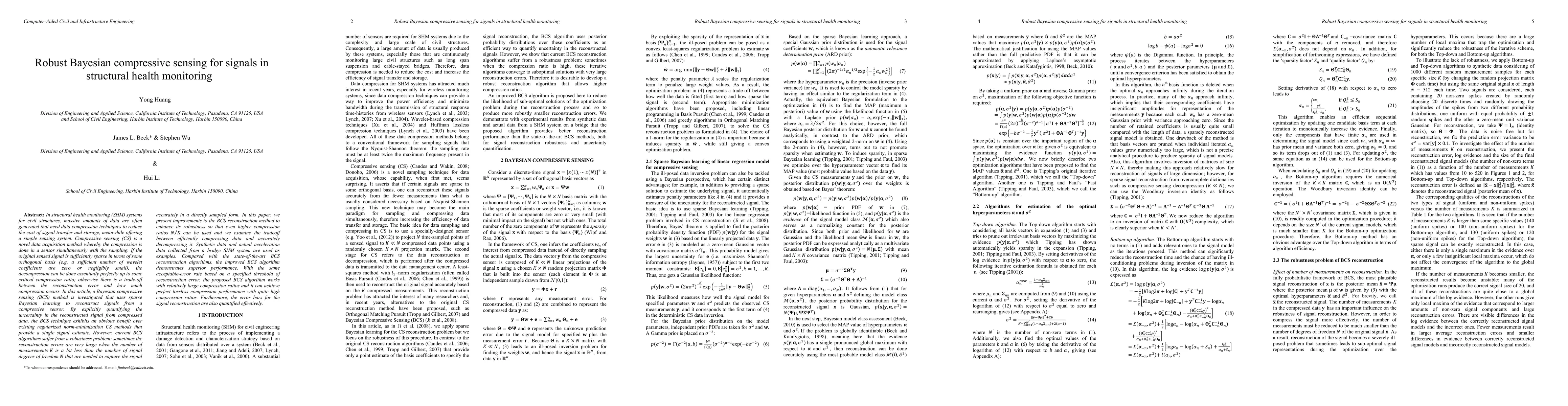 In structural health monitoring (SHM) systems, massive amounts of data are often generated that need data compression techniques to reduce the cost of signal transfer and storage. Compressive sensing (CS) is a novel data acquisition method whereby the compression is done in a sensor simultaneously with the sampling. If the original sensed signal is sufficiently sparse in terms of some basis, the decompression can be done essentially perfectly up to some critical compression ratio. In this article, a Bayesian compressive sensing (BCS) method is investigated that uses sparse Bayesian learning to reconstruct signals from a compressive sensor. By explicitly quantifying the uncertainty in the reconstructed signal, the BCS technique exhibits an obvious benefit over existing regularized norm-minimization CS methods that provide a single signal estimate. However, current BCS algorithms suffer from a robustness problem: sometimes the reconstruction errors are very large when the number of measurements is a lot less than the number of signal degrees of freedom that are needed to capture the signal accurately in a directly sampled form. In this paper, we present improvements to the BCS reconstruction method to enhance its robustness so that even higher compression ratios can be used and we examine the tradeoff between efficiently compressing data and accurately decompressing it. Synthetic data and actual acceleration data collected from a bridge SHM system are used as examples. Compared with the state-of-the-art BCS reconstruction algorithms, the improved BCS algorithm demonstrates superior performance. With the same reconstruction error, the proposed BCS algorithm works with relatively large compression ratios and it can achieve perfect lossless compression performance with quite high compression ratios. Furthermore, the error bars for the signal reconstruction are also quantified effectively.