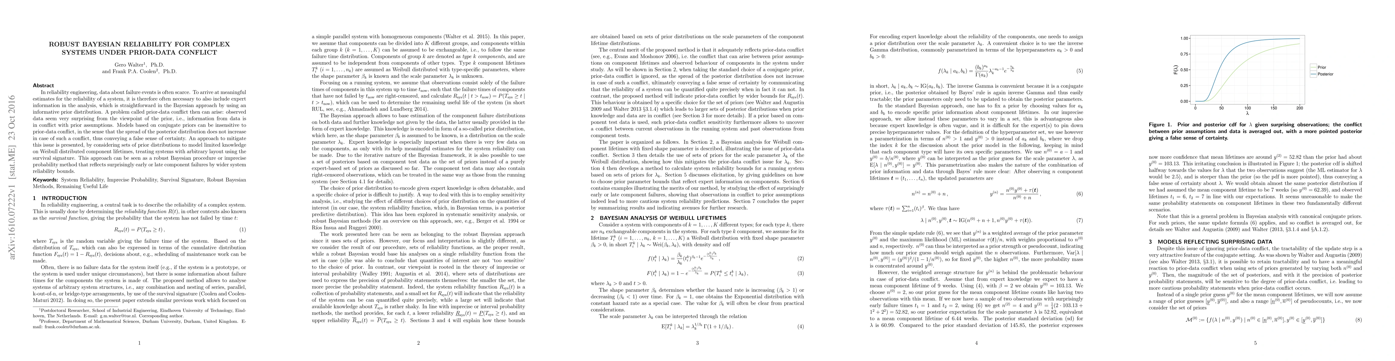 This paper proposes a robust Bayesian method to estimate reliability for complex systems when prior information conflicts with observed data, using a set of prior distributions instead of a single prior to better reflect uncertainties and avoid false certainty in reliability estimates.