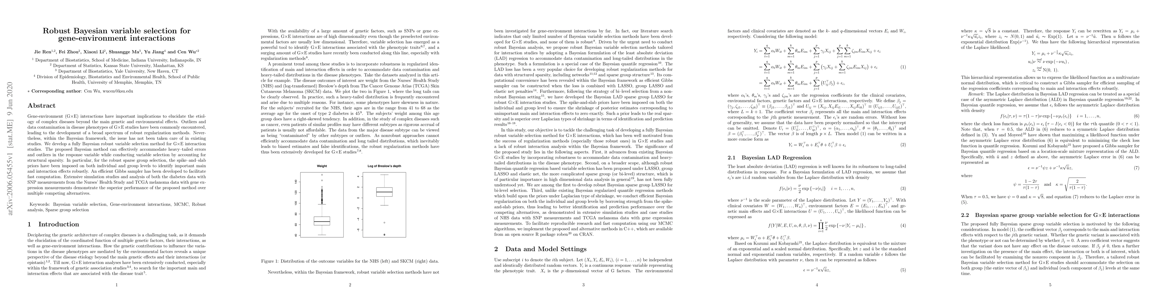 This paper proposes a fully Bayesian robust variable selection method for gene-environment interaction studies, addressing outliers and heavy-tailed errors through spike-and-slab priors. The method effectively identifies significant main and interaction effects and demonstrates superior performance in simulations and real data analyses.