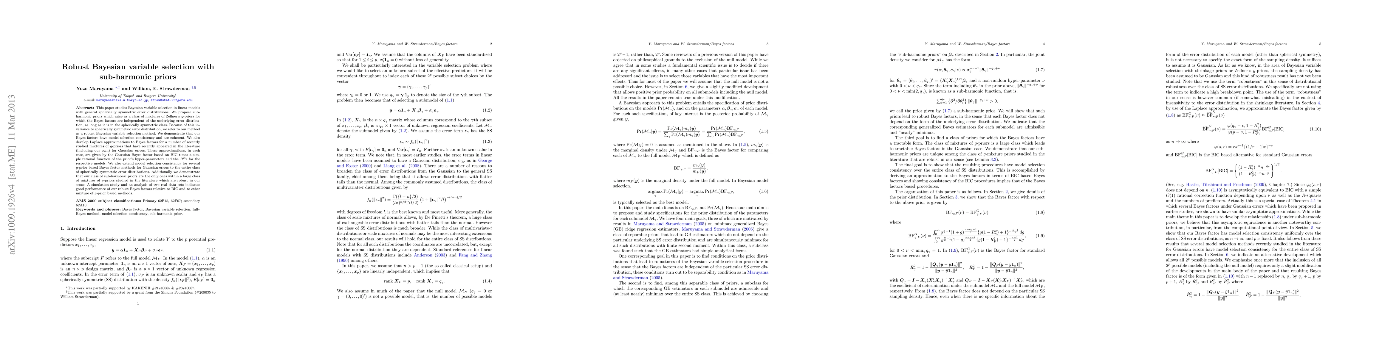 This paper proposes sub-harmonic priors for robust Bayesian variable selection in linear models, ensuring Bayes factors are invariant to spherically symmetric error distributions. The method demonstrates model selection consistency and good performance in simulations and real data analyses.