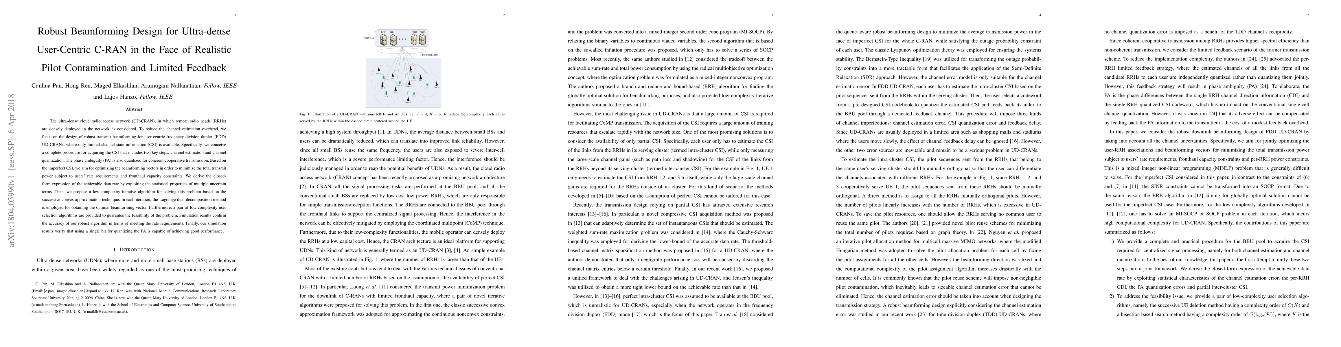 The ultra-dense cloud radio access network (UD-CRAN), in which remote radio heads (RRHs) are densely deployed in the network, is considered. To reduce the channel estimation overhead, we focus on the design of robust transmit beamforming for user-centric frequency division duplex (FDD) UD-CRANs, where only limited channel state information (CSI) is available. Specifically, we conceive a complete procedure for acquiring the CSI that includes two key steps: channel estimation and channel quantization. The phase ambiguity (PA) is also quantized for coherent cooperative transmission. Based on the imperfect CSI, we aim for optimizing the beamforming vectors in order to minimize the total transmit power subject to users' rate requirements and fronthaul capacity constraints. We derive the closed-form expression of the achievable data rate by exploiting the statistical properties of multiple uncertain terms. Then, we propose a low-complexity iterative algorithm for solving this problem based on the successive convex approximation technique. In each iteration, the Lagrange dual decomposition method is employed for obtaining the optimal beamforming vector. Furthermore, a pair of low-complexity user selection algorithms are provided to guarantee the feasibility of the problem. Simulation results confirm the accuracy of our robust algorithm in terms of meeting the rate requirements. Finally, our simulation results verify that using a single bit for quantizing the PA is capable of achieving good performance.