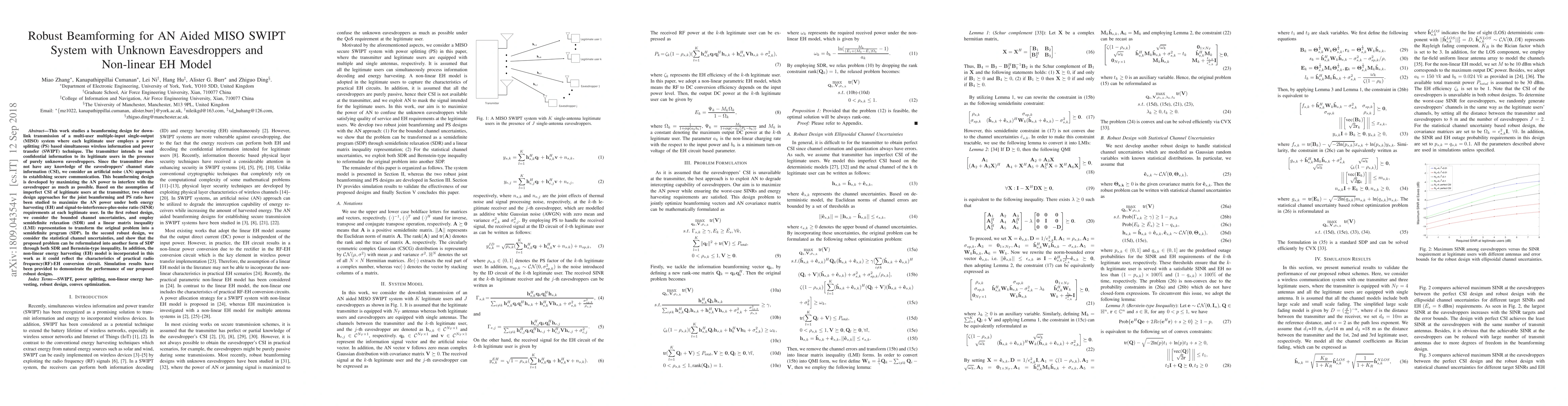 This paper proposes robust beamforming techniques for secure MISO SWIPT systems with unknown eavesdroppers, employing artificial noise to maximize interference. Two robust design approaches are developed to optimize beamforming and power splitting under energy harvesting and SINR constraints, considering both bounded and statistical channel uncertainties.
